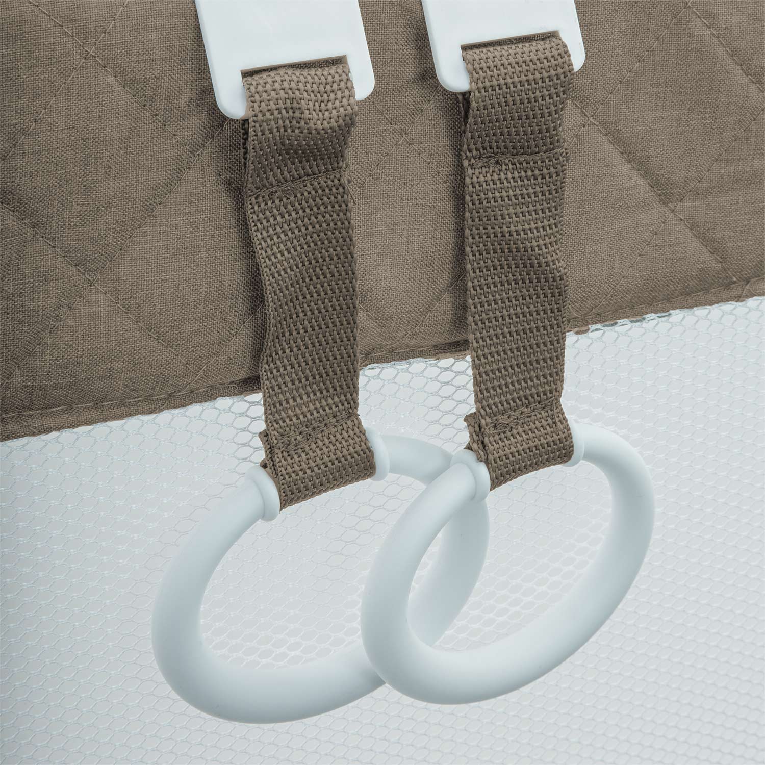 - прицепные кольца можно использовать как подвесы для игрушек, а когда ребенок подрастет, он сможет подтягиваться с их помощью и вставать на ножки;