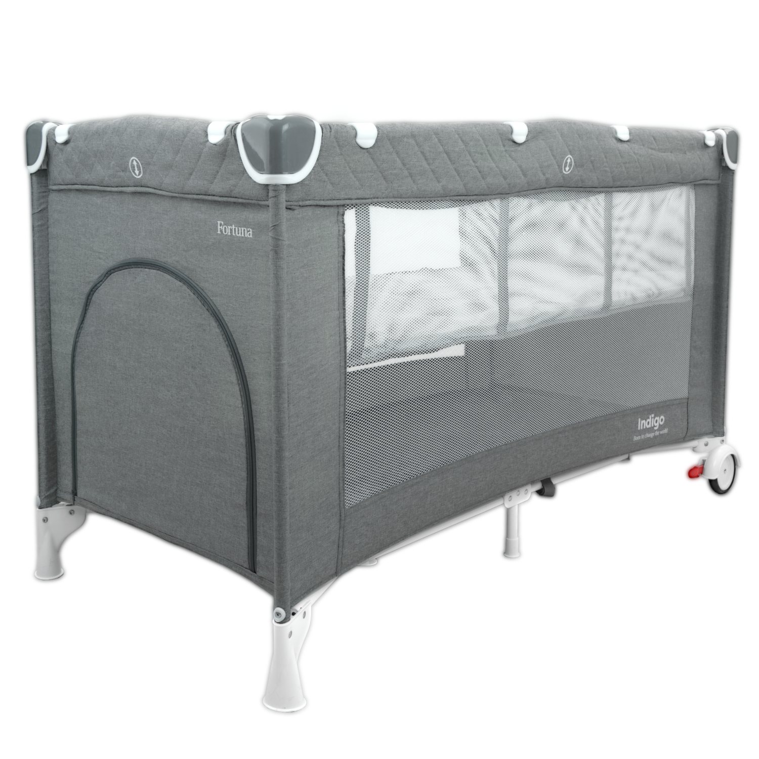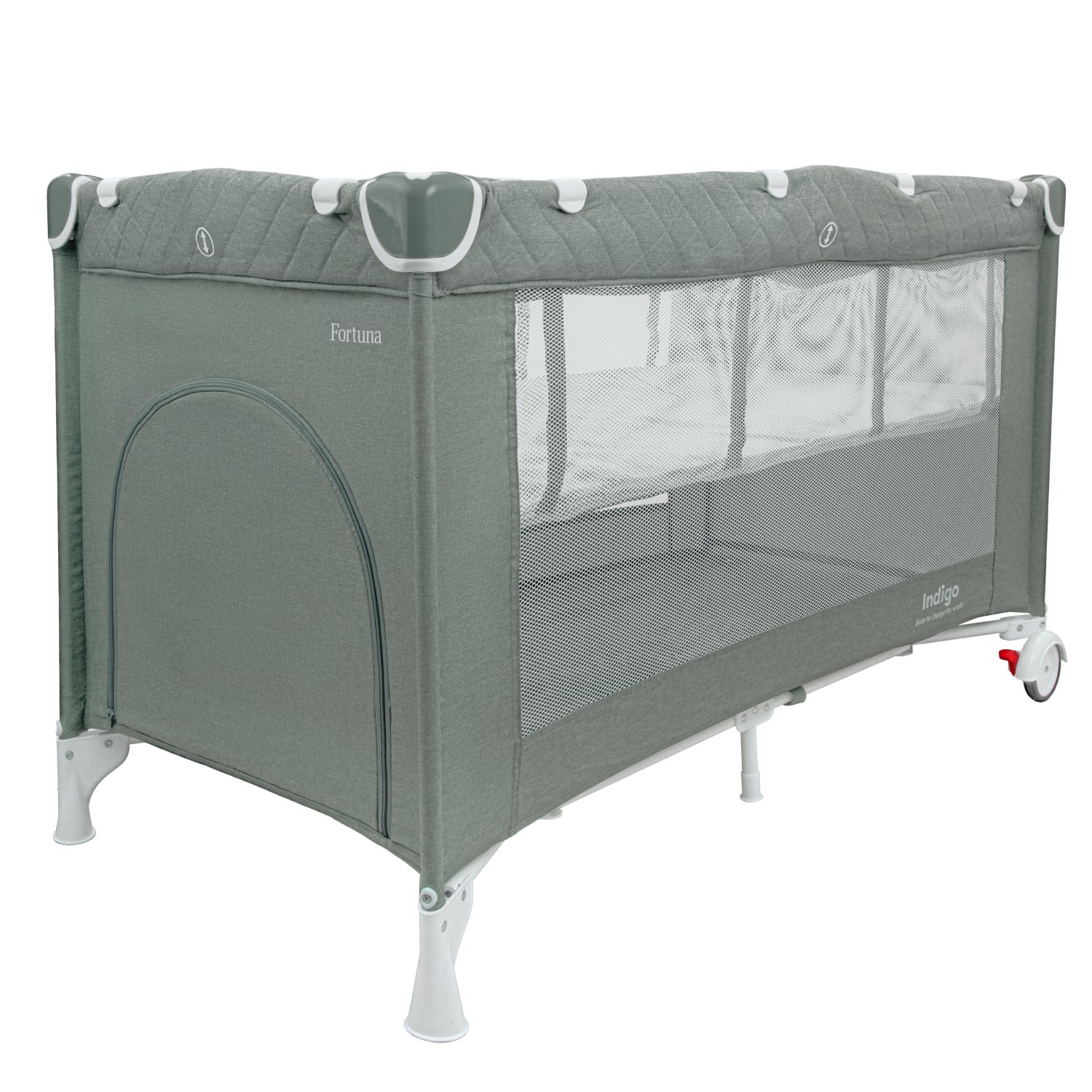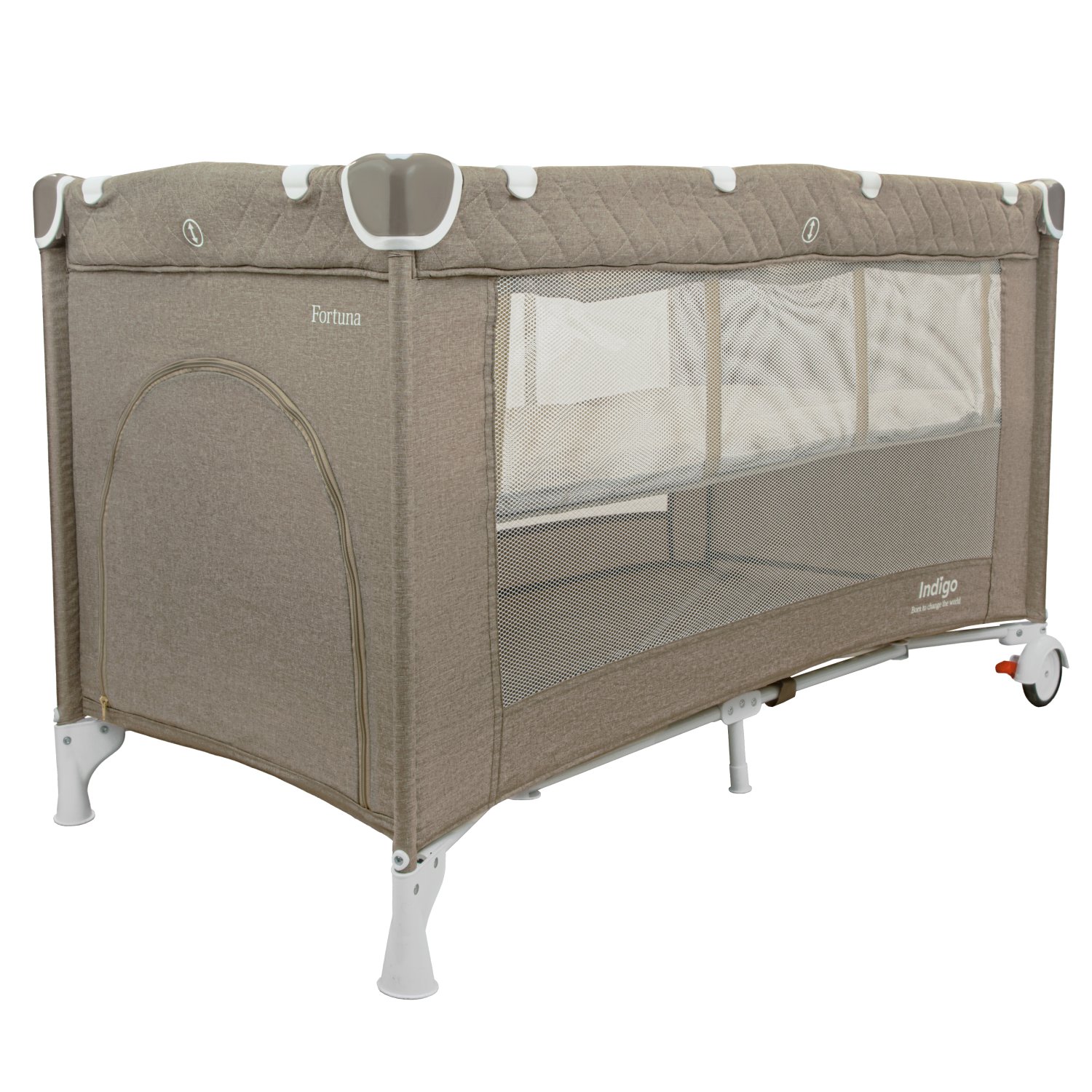 Манеж-кровать Indigo FORTUNA (Индиго фортуна) - удобное место для полноценного сна и безопасных игр для ребенка с рождения до 3 лет (до 20 кг). Преимущество такой модели в ее функциональности, легком весе и очень компактном сложении. Кроватка - манеж в сложенном виде очень компактная и не занимает много места, при покупке идет в специальной сумке-чехле, в которой сложенную кроватку удобно хранить и переносить. В разложенном виде кроватка имеет удобные габариты для сна и игр. А так же удобные колеса для легкого перемещения по комнате. Спальное место кровати по размерам, такое же как у большинства стандартных кроваток, 120х60 см. Поэтому, при желании, вы сможете дополнительно приобрести в данную модель ортопедический матрасик размерами 120х60 см. Для новорожденного ребенка предусмотрен "верхний" уровень кроватки. Ребенок будет находиться выше и маме будет легче укладывать и брать ребенка на ручки. По достижению ребенком 9 кг, или с момента, когда ребенок начинает крутиться, спальное ложе переносить на нижний уровень.