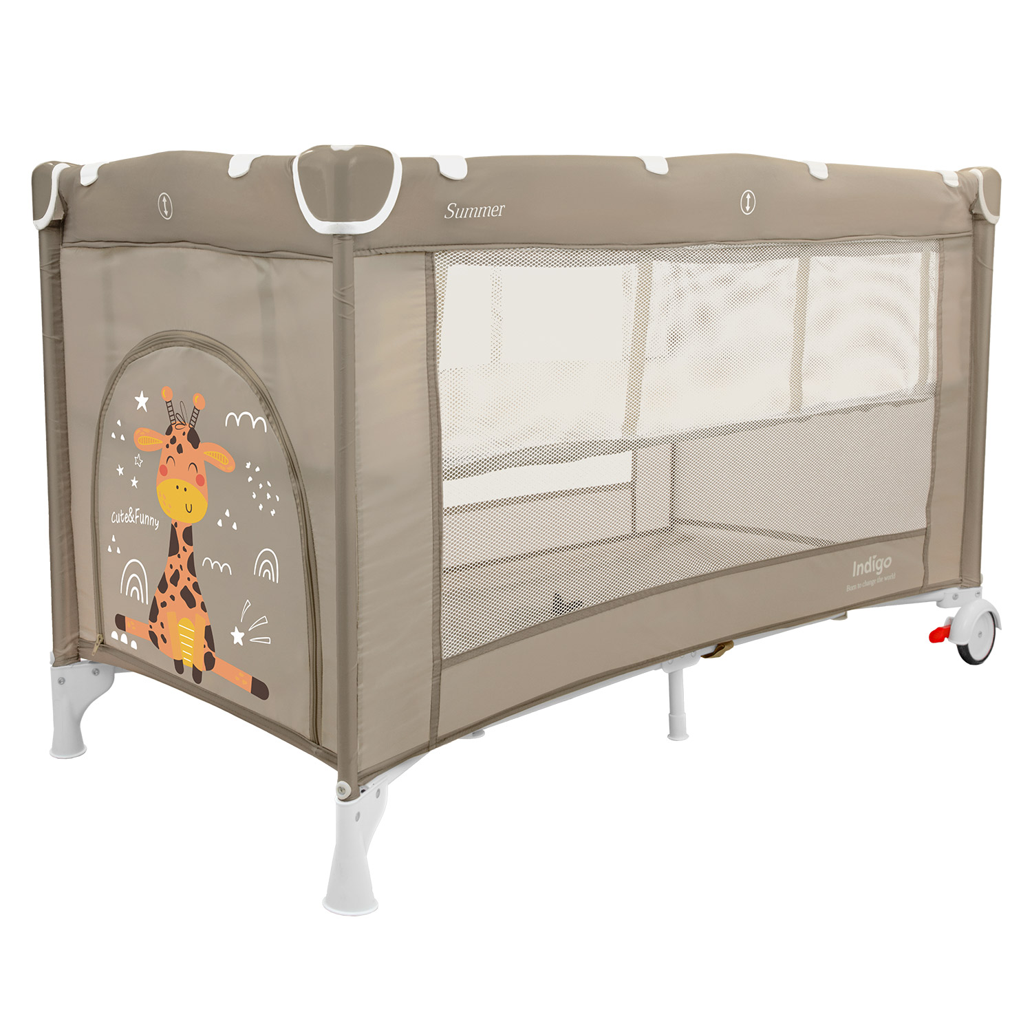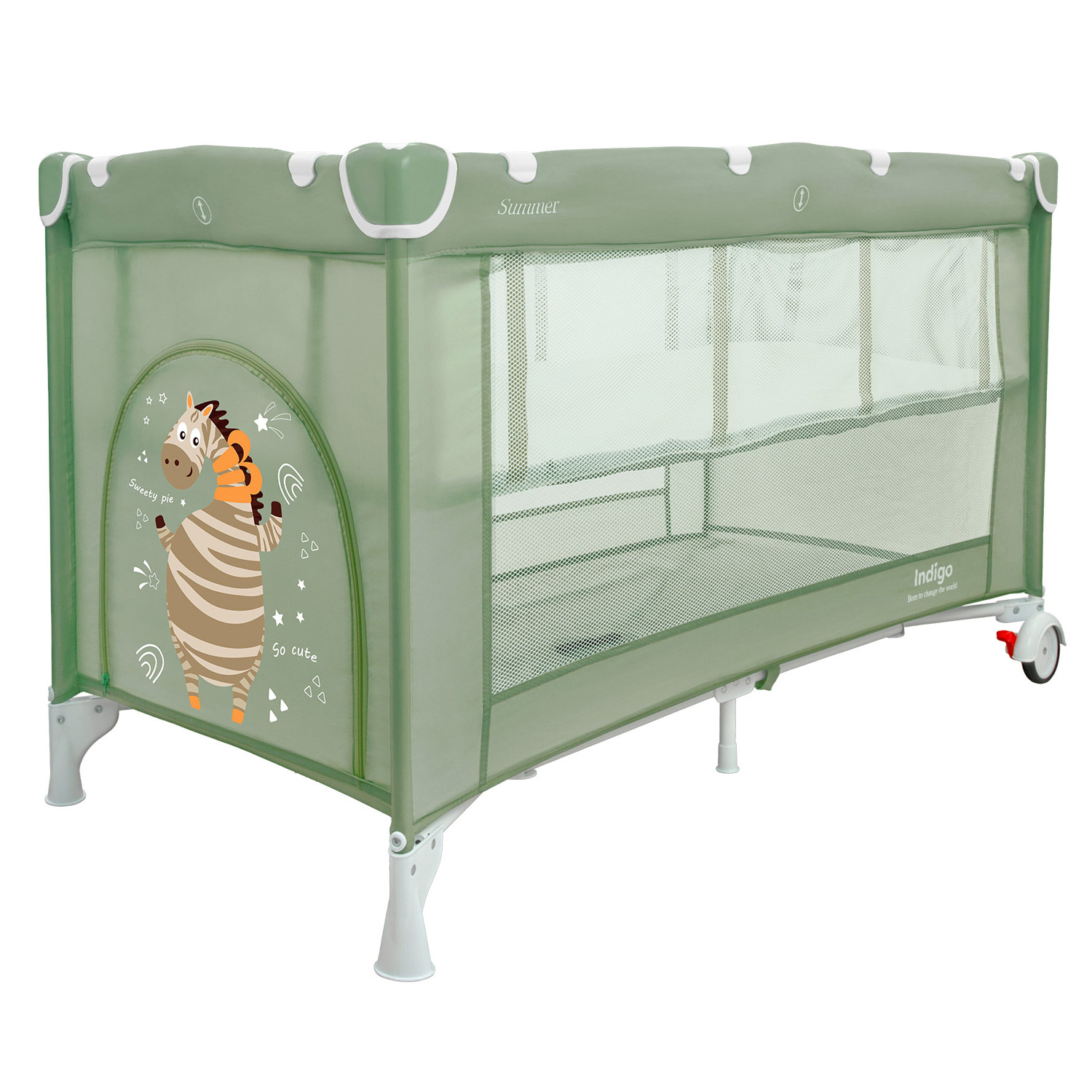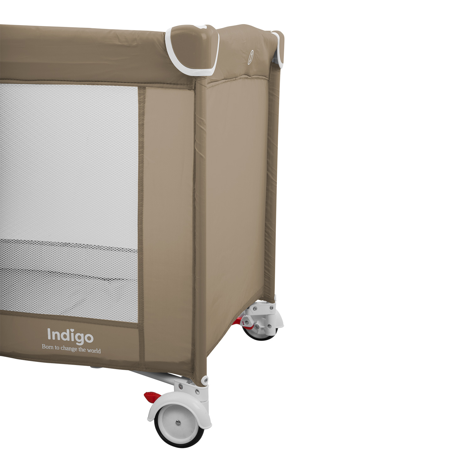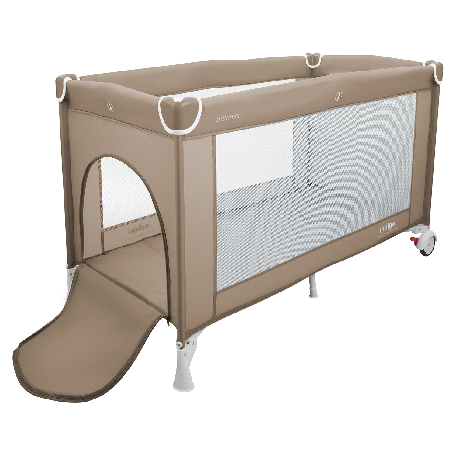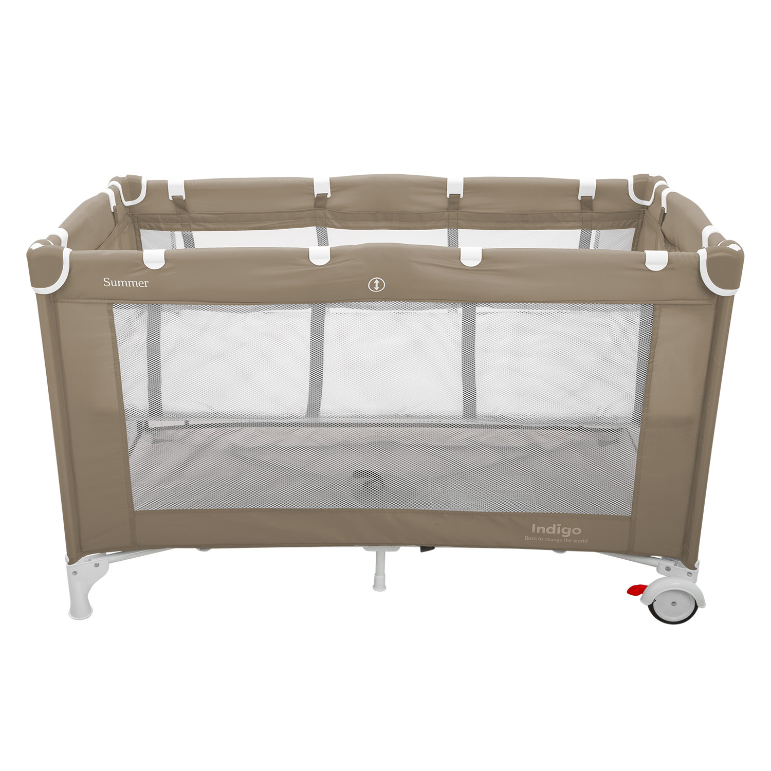 Манеж-кровать Indigo SUMMER с 2 уровнями (Индиго Саммер) - максимальный комфорт для вашего крохи. Это удобная складная кроватка для полноценного сна ребенка до 3 лет (до 20 кг), а так же безопасное пространство для самостоятельных игр. Преимущество модели в том, что она очень быстро раскладывается и складывается, занимает мало места и удобно перемещается за счет колес. Куда вы не отправились с ребенком, у ребенка всегда будет удобное и комфортное спальное место. Поездка к родственникам или друзьям, поезд, отель, пикник на природе - нет ни чего проще, взять с собой манеж кровать, в котором малыш может играть и спать, при этом всегда находится в безопасности. Спальное /игровое пространство составляет 120х60 см. Сетчатые боковые стенки обеспечат обзор за ребенком и отличную вентиляцию. С одной стороны манежа предусмотрен лаз на молнии. В комплекте с манежем идет транспортировочная сумка - чехол, москитная сетка и кольца, чтобы помочь малышу самостоятельно встать на ножки.