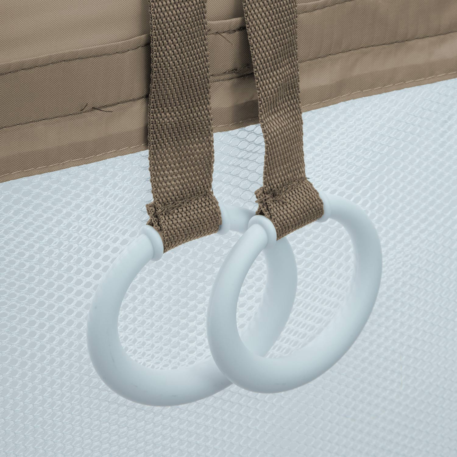 - прицепные кольца можно использовать как подвесы для игрушек, а когда ребенок подрастет, он сможет подтягиваться с их помощью и вставать на ножки;
