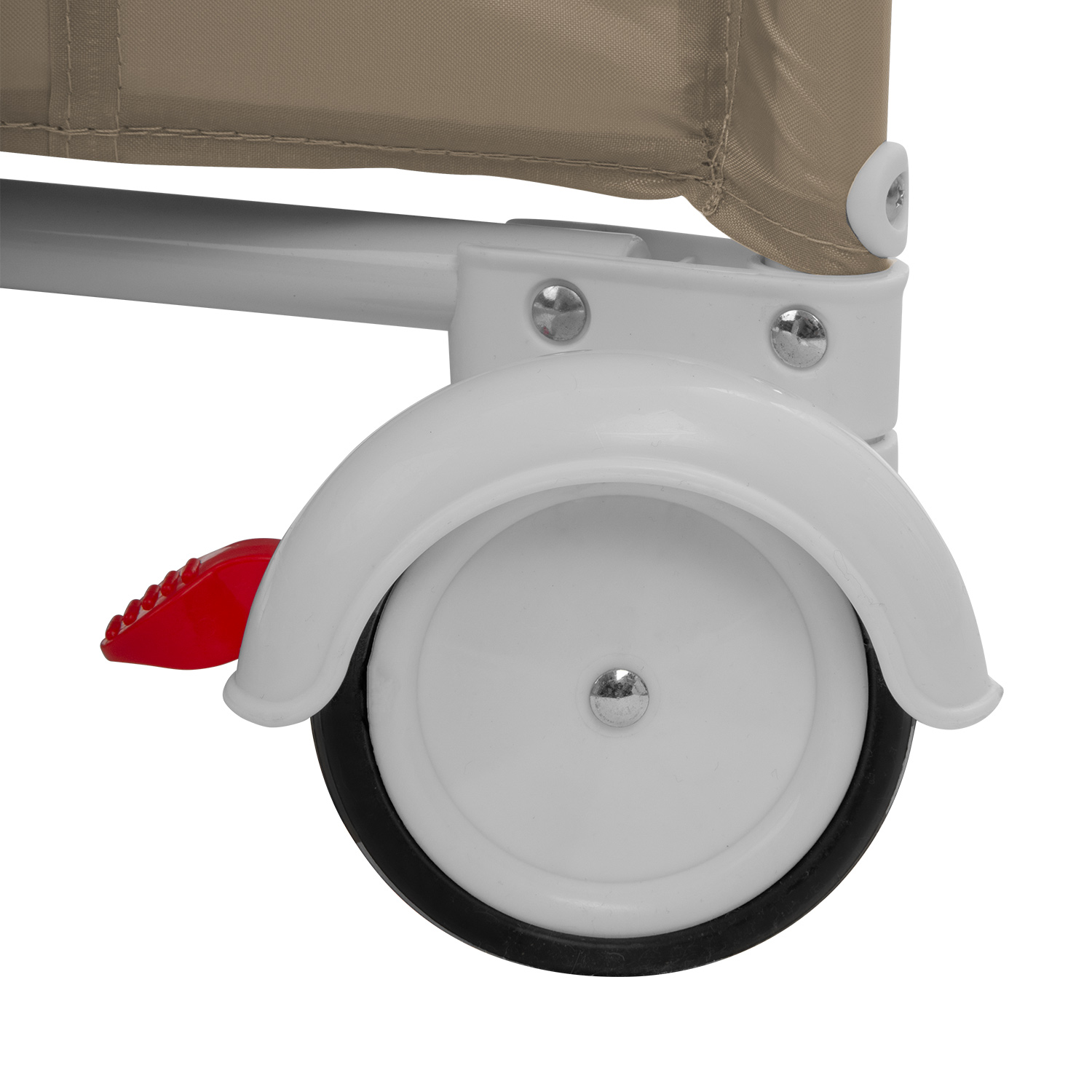 - оснащен двумя колесиками с фиксаторами, с помощью которых манеж можно перемещать по квартире;