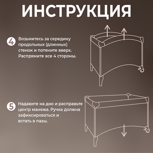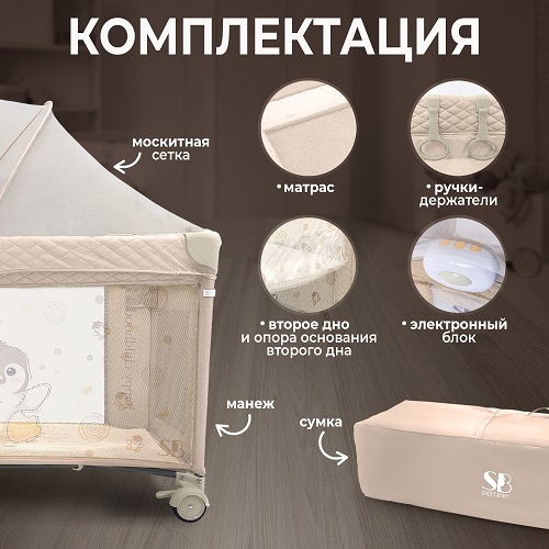 Комплектация: матрасик, дуга с москитной сеткой, музыкальный блок, кольца-держатели, подвесной уровень, сумка для хранения, пеленальный столик.