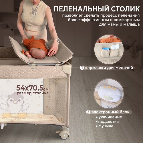 - так же, большое количество кармашков, которые позволят держать все самое необходимое рядом с ребенком и электронная панель с мягким ночником с 3 переливающимися цветами света, проигрывает приятные мелодии (12 вариантов с тремя уровнями громкости) и создает легкую вибрацию (3 уровня) , способствуя убаюкиванию малыша.