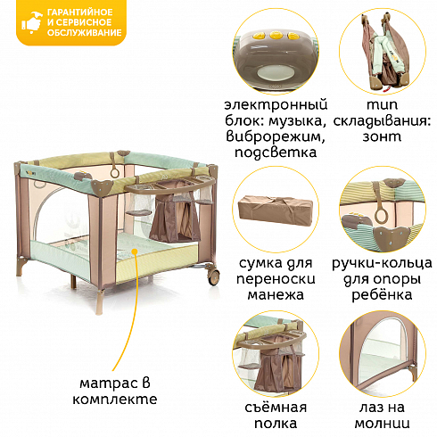 Электронный музыкальный блок и виброукачивание сделают пребывание ребенка в манеже более увлекательным и интересным. В зависимости от выбранной вами мелодии вы можете создать приятный фон для игр или настроить малыша на сон.
