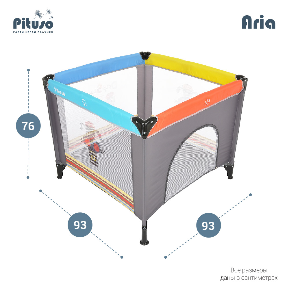 Манеж PITUSO ARIA (Питусо Ария) - большой игровой манеж для безопасных игр ребенка. В комплектации предусмотрен матрасик, чтобы ребенку было тепло и комфортно. Есть специальные кольца- держатели для малышей которые учатся вставать. С одной стороны предусмотрен удобный лаз на молнии, благодаря которому ребенок постарше сможет самостоятельно залазить и вылазить из "домика". Все стенки манежа сетчатые, что обеспечит отличную вентиляцию и хорошую видимость. Манеж удобно складывается и раскладывается по типу зонтика. Для транспортировки и хранения предусмотрена специальная сумка-чехол. Манеж удобно использовать дома и на природе.