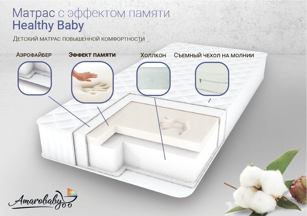 Матрас AmaroBaby с эффектом памяти Healthy Baby (прямоугольный) 120х60 см (Амаробеби) - уникальный матрас с эффектом памяти, который сделает пребывание ребенка в кроватке очень приятным, комфортным и полезным для спины. Уникальный материал наполнителя ЭФФЕКТ ПАМЯТИ идеально подходит для крохи. Его отличие в структуре и форме ячеек. Вязкоэластичный пенополиуретан состоит из ячеек, отличающихся по размеру, толщине стенок и расположены они в хаотичном порядке. Благодаря этой особенности нагрузка распределяется между маленькими и большими ячейками. Матрас из этого материала более долговечен и способен менять форму, которая быстро восстанавливается. Поэтому его отличительная особенность в способности подстраиваться под тело малыша и дарить волшебные сны.