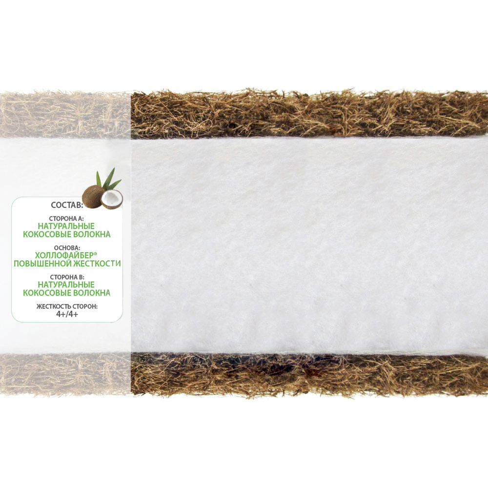 Кокос относится к линейке оптимально-жестких, дышащих наполнителей высокой упругости, правильной жесткости и с высоким показателем сопротивления сжатию. Благодаря инновационной технологии производства, кокосовая койра, скреплённая гипоаллергенными полиэфирными волокнами, не только не теряет свойств кокоса, но и на порядок улучшает их.