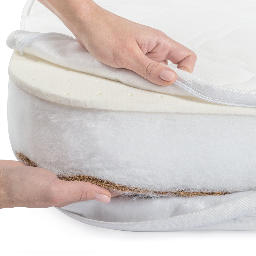 Внутреннее наполнение матраса состоит из трёх слоёв: с одной стороны натуральное кокосовое волокно, с другой стороны анатомический латекс и слой холлофайбера посередине. Они обладают идеальными для наполнителей качествами и позволяют выбрать наиболее комфортные условия исходя из потребностей малыша.