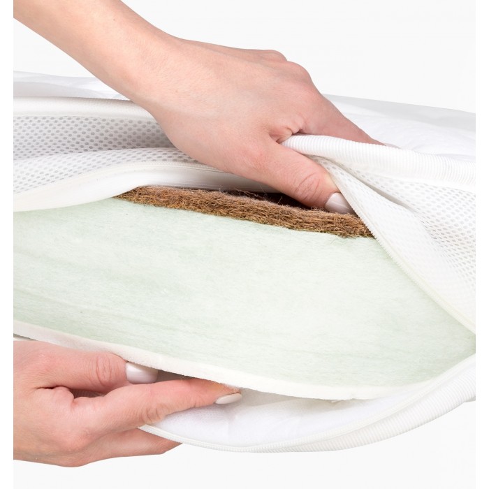 Состав: наполнитель - кокосовая койра, высокоэластичный пенополиуретан (марка HR33), латекс, нетканый материал Airotek; съемный чехол - трикотаж StressFree (верхний слой 100% хлопок, нижний слой 100% полиэстер)