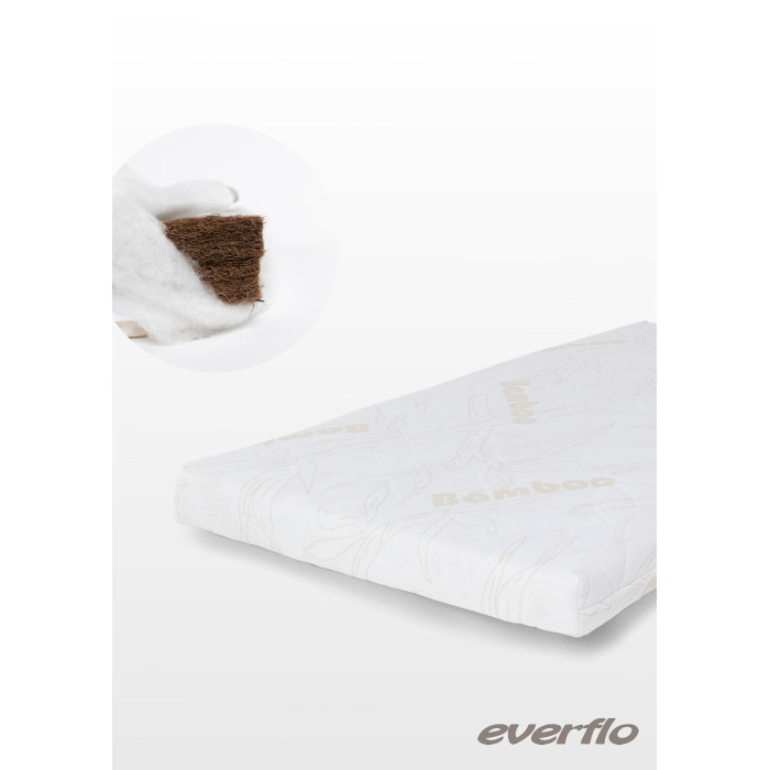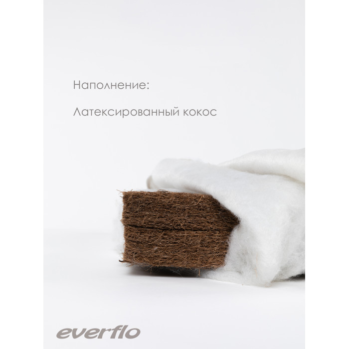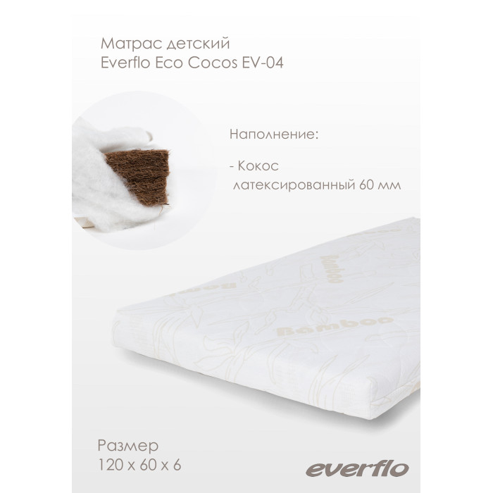 Матрас Everflo Eco Cocos EV-04 (Еверфло) - отличный выбор для детской кроватки. Модель средней жесткости обеспечивает анатомическую поддержку головы и позвоночника малыша. Спрессованные волокна кокоса, пропитанные латексом, на долгое время сохраняет прочность и первоначальную форму изделия. Модель поддерживает оптимальный температурный баланс, не впитывает влагу и запахи.