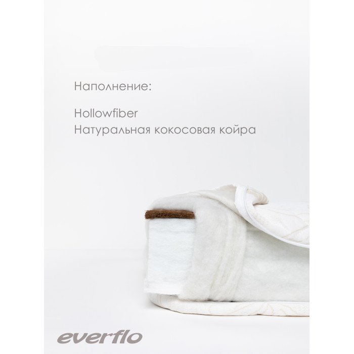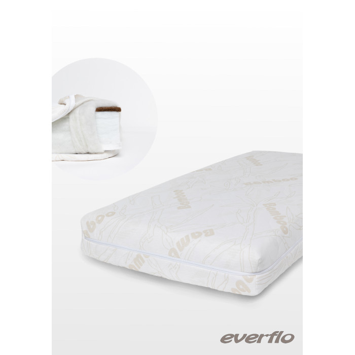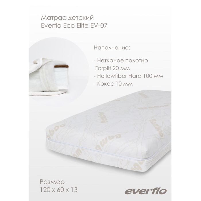 Матрас Everflo Elite EV-07 (Еверфло) - еспружинный матрас прямоугольной формы для детей от 0 до 3 лет — идеальный вариант для спокойного сна в течение всей ночи. Гипоаллергенные материалы высокого качества (высокоплотный Hollowfiber Hard, натуральная кокосовая койра) обеспечат ребенку анатомически правильное положение тела в любой позе. Матрас не впитывает влагу и запахи. Съемный стеганый чехол из трикотажа Bamboo имеет трехстороннюю внутреннюю молнию, его легко стирать при минимальной температуре.