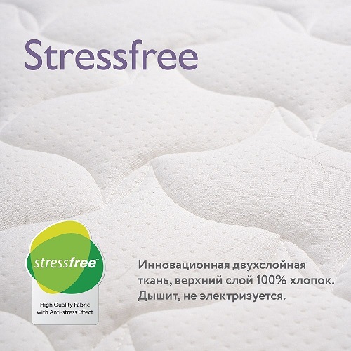 Stress Free — инновационный материал, специально обработанная трикотажная ткань из двух слоев. Нижний слой – пористый, дышащий, верхнее покрытие – 100% хлопок. На ощупь очень мягкая и нескользящая. Своим названием она обязана свойству быстро и безопасно снимать с тела человека и выводить в воздух статическое напряжение, причем своих антистатических свойств ткань не теряет и после стирки. Чехол хорошо проветривается, не электризуется. Ребенок на таком матрасике не будет потеть.