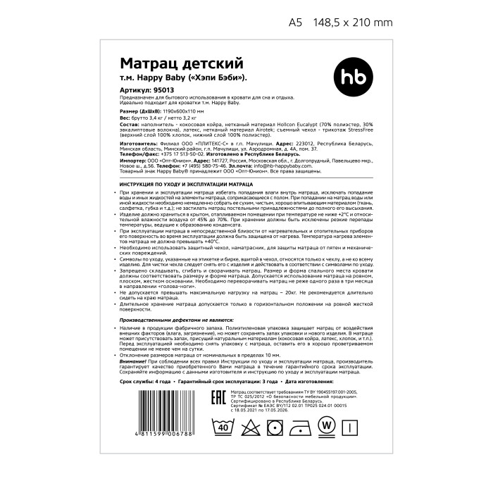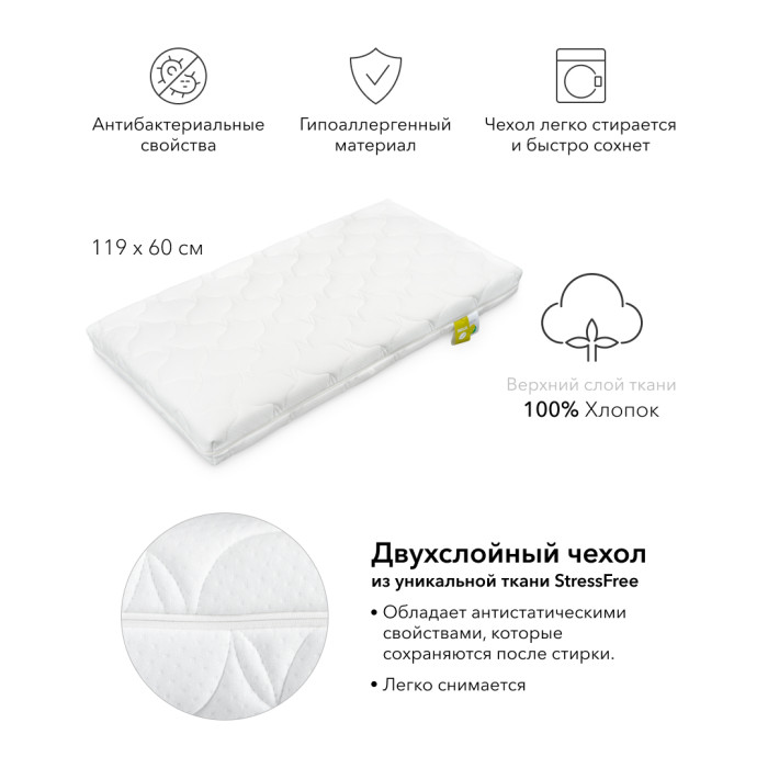 Стеганный двухслойный чехол матраса - съемный, легко стирается в машинке и быстро сохнет. Он изготовлен из уникальной ткани StressFree, обладающей антистатическими свойствами, которые сохраняются после стирки. Верхний слой ткани - 100% хлопок высшего качества, для стежки чехла использован гипоаллергенный материал Hollcon, способный регулировать температуру и сохранять форму. Этот матрас идеально подходит для кроватки HappyBaby.