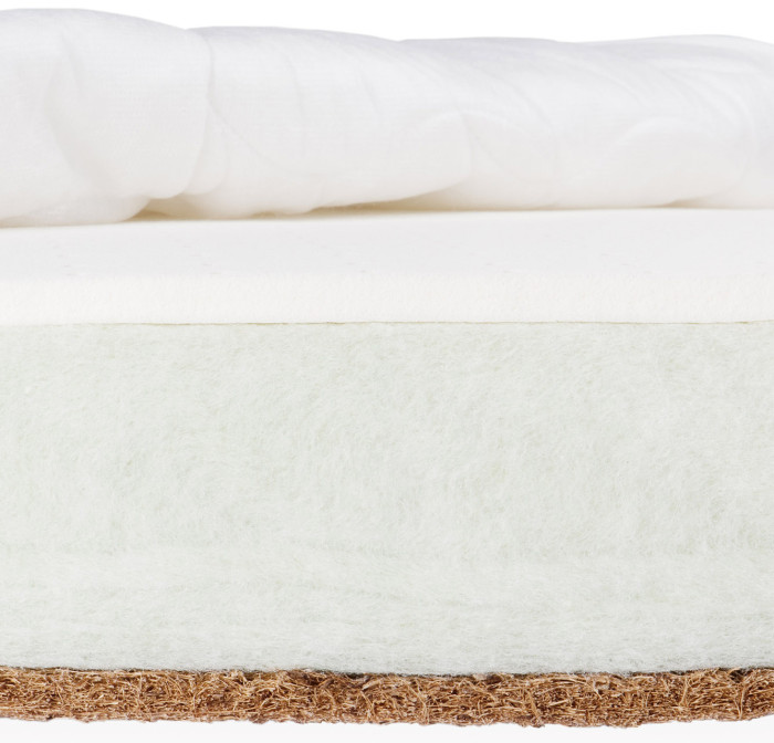 Модель предназначена для сна в разном возрасте. С одной стороны слой натуральной латексированной кокосовой койры 10 мм, он обеспечивает максимальный ортопедический эффект, необходимый новорожденному (жесткость 5 из 5). С другой - латекс, природный эластичный материал, который подарит ребенку особый комфорт благодаря точечному распределению нагрузки. На этой стороне мы рекомендуем спать детям после года (слой 10 мм, жесткость 4 из 5).