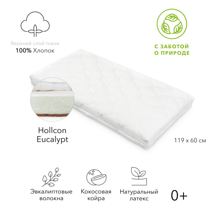 В основе матраса новейшая разработка Hollcon Eucalypt, которая позволила объединить преимущества натуральных и инновационных материалов. Наполнитель обладает антибактериальными свойствами, прекрасно восстанавливает форму, не имеет запаха.