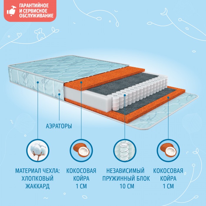 • В матрасе по периметру присутствуют аэраторы (вентиляционные воздушные отверстия), они способствуют свободной циркуляции воздуха внутри конструкции матраса для обеспечения комфортного сна и долговечности изделия
