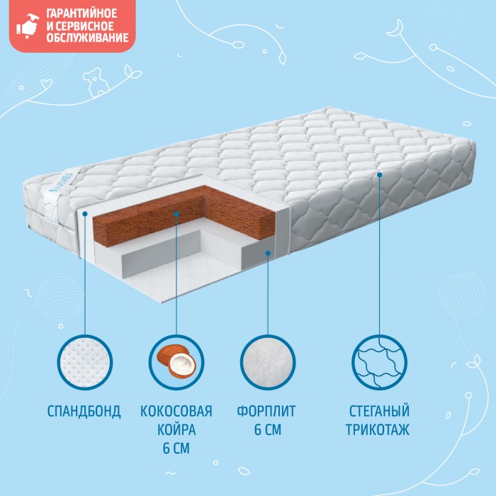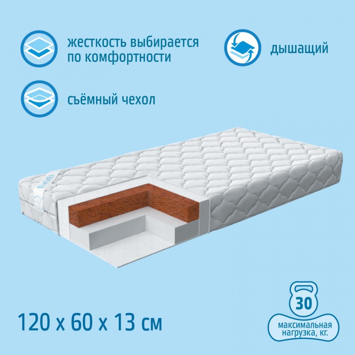 Матрас Nuovita Classico 120х60х13 см (Нуовита классико) - Детский ортопедический матрас. Максимальная нагрузка на матрас 30 кг. Состав наполнителя: Forplit 6 см + кокос 6 см + спанбонд. Жесткость матраса средняя. Чехол матраса съёмный, выполнен из стеганного трикотажного полотна.