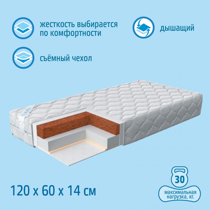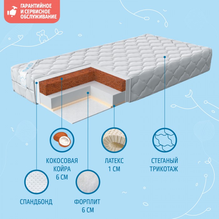 • Состав наполнителя: латекс 1 см + Forplit 6 см + кокос 6 см + спанбонд.