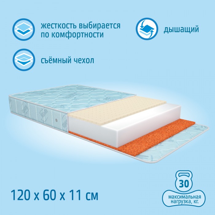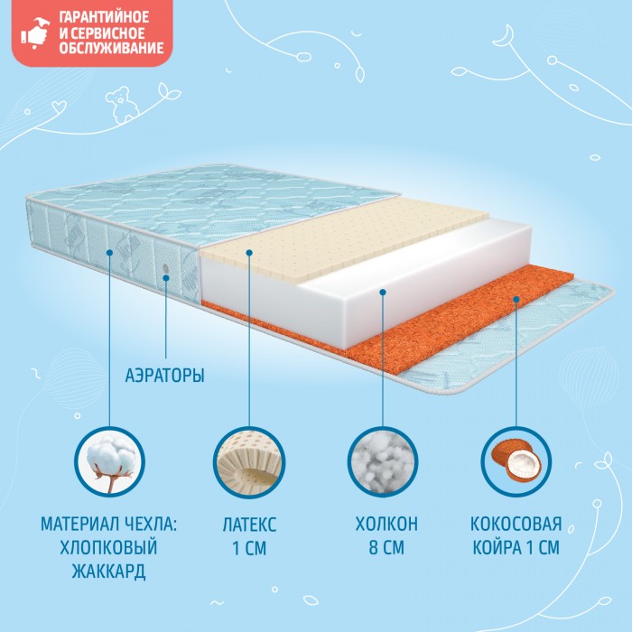- Состав наполнителя: холкон 8 см + кокос 1 см + латекс 1 см и аэраторы.