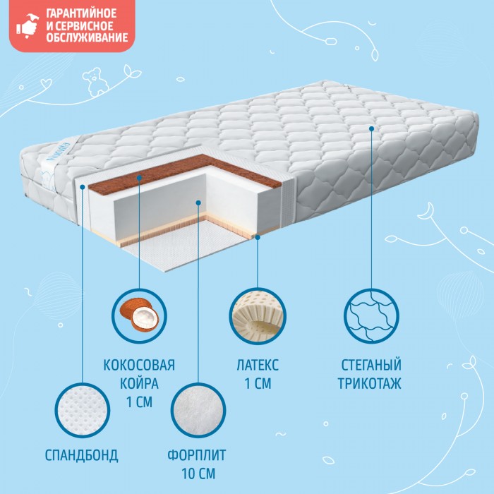 - Состав наполнителя: латекс 1 см + Forplit 10 см + кокос 1 см + спанбонд.