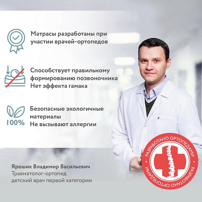 - Забота о безопасности. В разработке матраса участвовали квалифицированные детские врачи, поэтому мы учли особенности развития детей 3-7 лет. Мы использовали качественные сертифицированные материалы. Матрас успешно прошел испытания по 16 критериям (например, на отсутствие формальдегидов, фенолов, стиролов).
