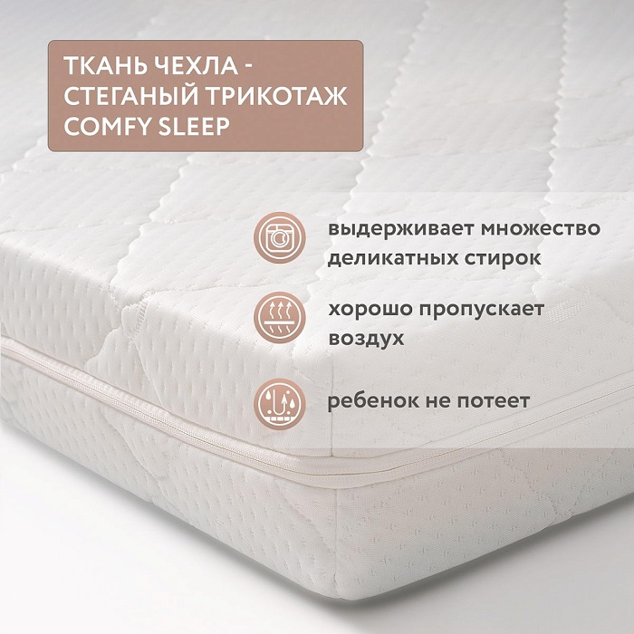 Съемный чехол из двухслойной стеганой трикотажной ткани. Мягкая, нескользящая поверхность дарит комфортный сон малышу. Чехол хорошо проветривается. Ребенок на таком матрасике не будет потеть. Молния вшита по трем сторонам чехла — так его легче снимать и надевать после стирки.