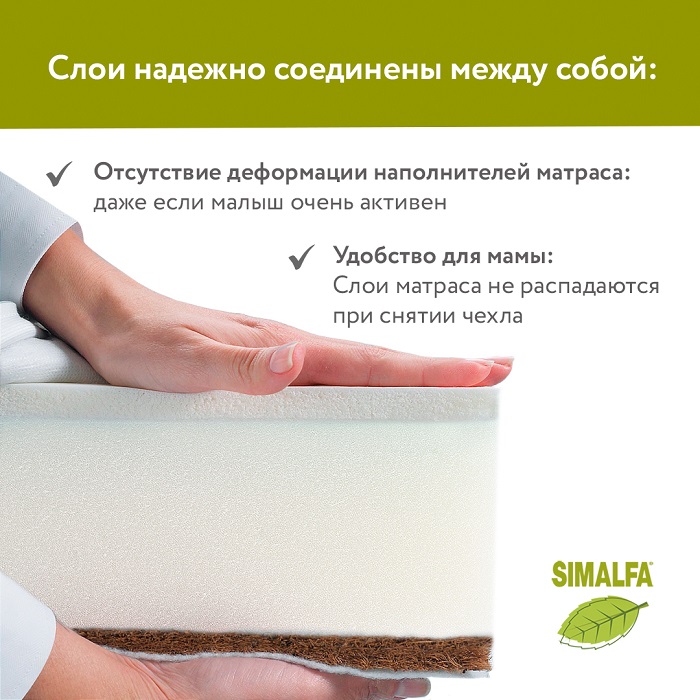 Для удобства слои наполнителей соединены между собой — экологичным составом на водной основе, он не имеет цвета и запаха и абсолютно безопасен для ребенка (SIMALFA, Швейцария).