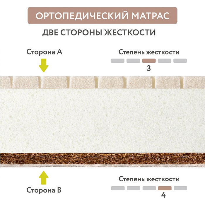 Более жесткая сторона матраса (условная жесткость 4 из 5, тут натуральная кокосовая койра) рекомендуется для иправления нарушений в осанке.