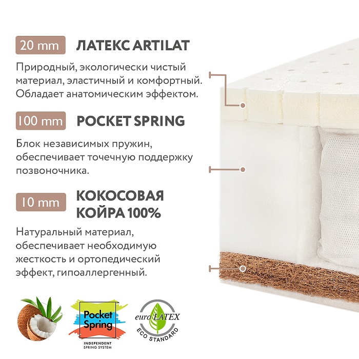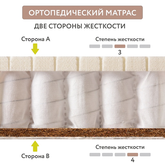- Кокосовая койра с другой стороны (20 мм) — сторона для профилактики деформаций позвоночника. Натуральная кокосовая койра гарантирует ровную плотную поверхность для сна. Материал известен своими ортопедическими свойствами и неприхотливостью.