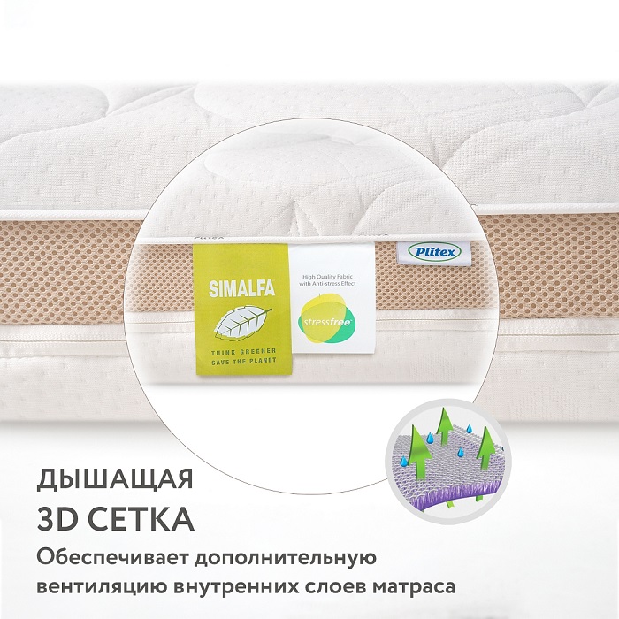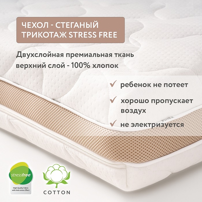 - Чехол StressFree — стеганый трикотажный чехол с поверхностью из 100% натурального хлопка. Материал обладает антистатическими свойствами, то есть устраняет проблему статического электричества, даже если ребенок ворочается во сне.