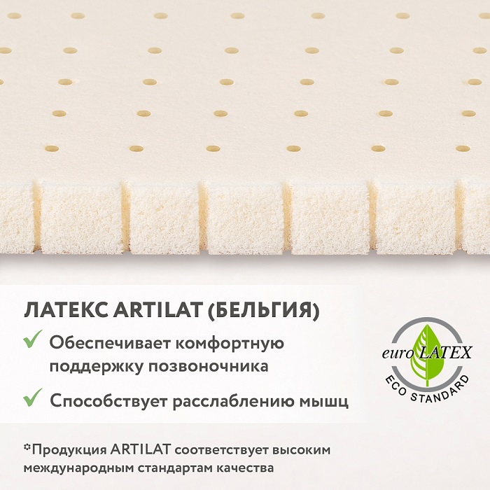 - Латекс с одной стороны (20 мм) — натуральный латекс создает точечное распределения нагрузки и позволяет телу расслабиться во время сна. При этом упругая поверхность поддерживает тело в правильном положении.