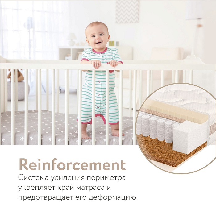 Основная сторона предназначена для повседневного сна, она умеренной жесткости (условная жесткость 3 из 5), поддерживает позвоночник в правильном положении и обеспечивает точечное распределение нагрузки тела таким образом, чтобы во сне мышцы ребенка расслаблялись и ему спалось как можно комфортнее.
