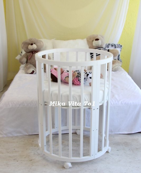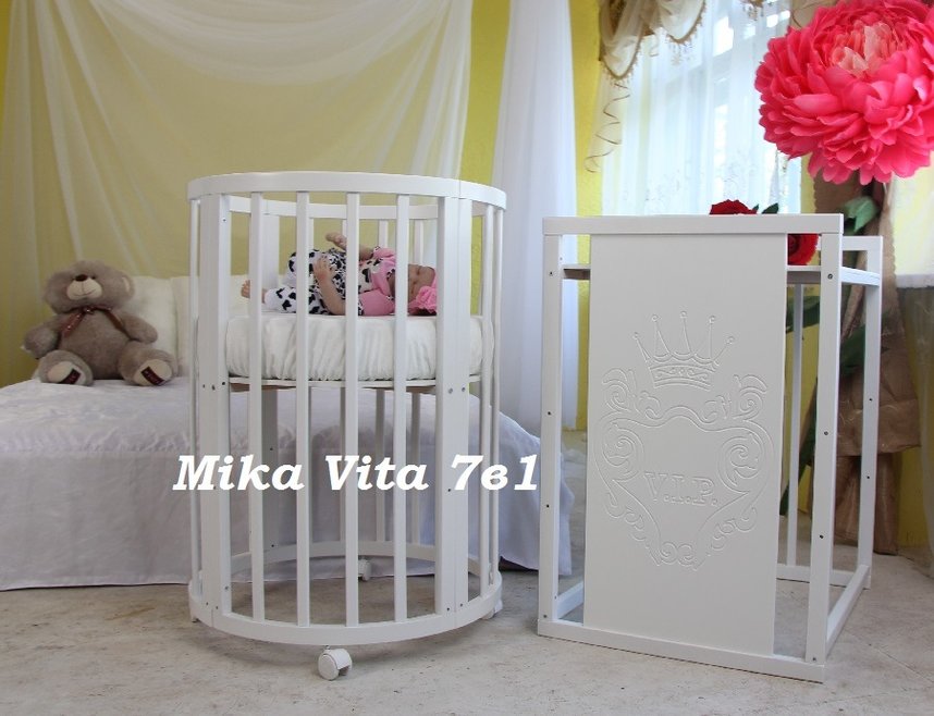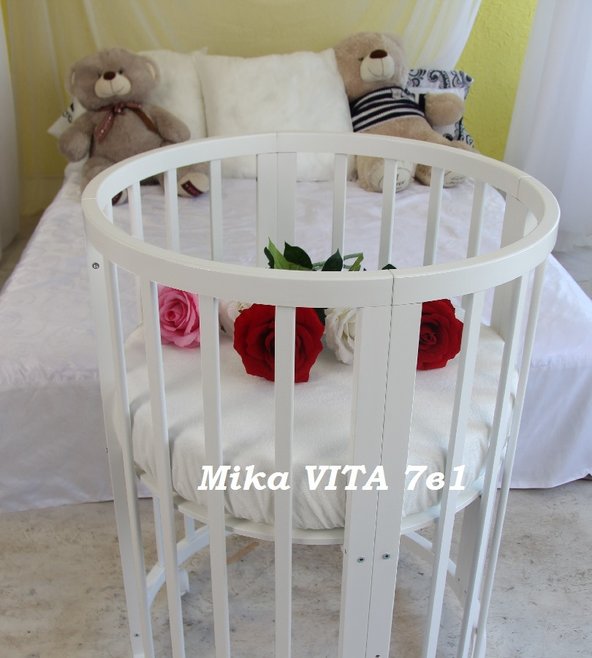 Кровать-трансформер MIKA VITA (мика вита) - круглая и овальная кровать с высокими бортиками и фигурной резьбой. Модель имеет небольшую ширину и с легкостью пройдет в любой дверной проем. Бортики имеют увеличенную высоту, что позволит не беспокоиться за безопасность ребенка, когда он начнет самостоятельно вставать в кроватке. Эта модель-трансформер удовлетворит различные потребности ребенка в разные периоды его роста. Для новорожденного предусмотрена круглая «колыбелька» и пеленальный столик, для ребенка от 4 месяцев –овальная кровать, а в дальнейшем диван. Когда ребенок вырастет из кровати можно собрать стол и 2 стула.