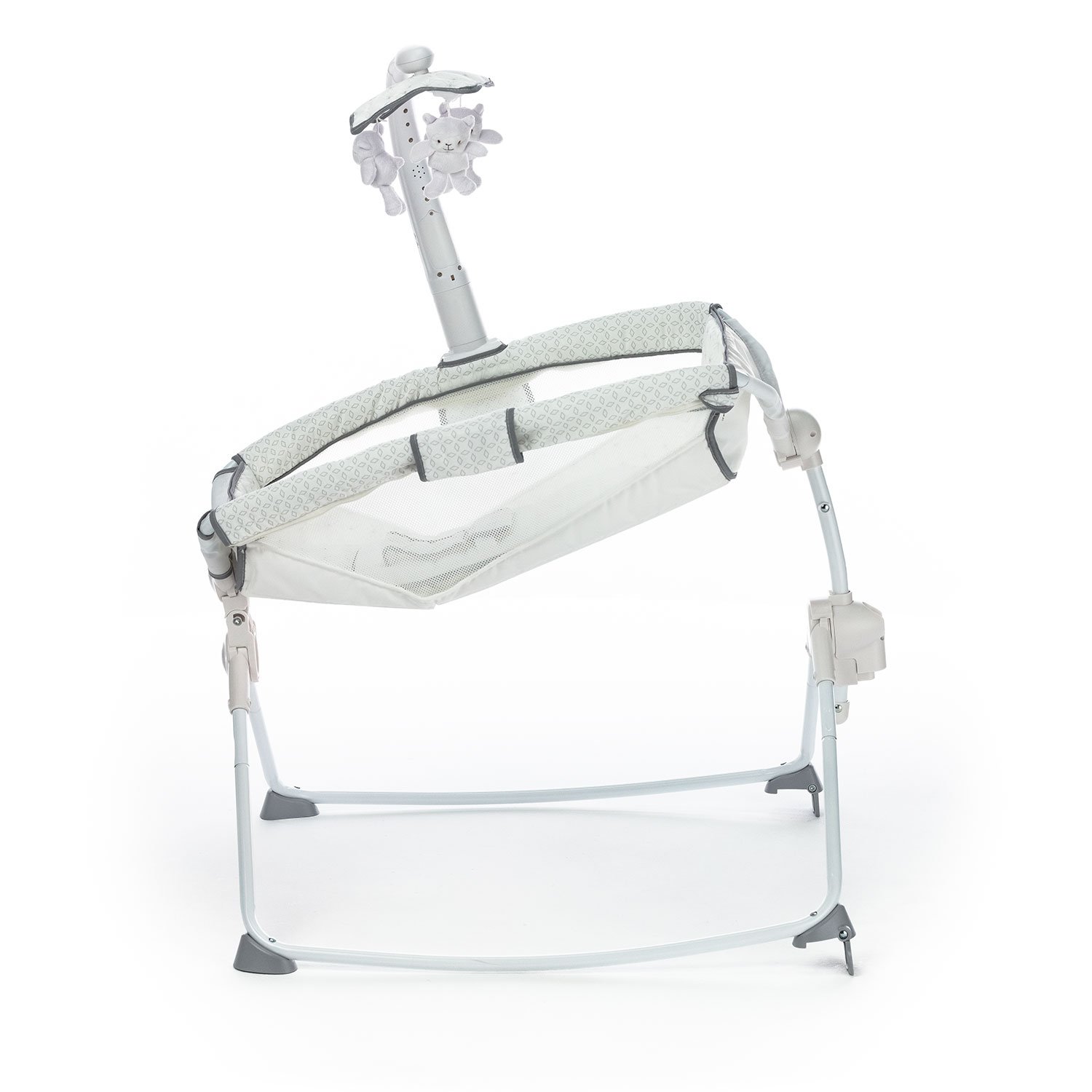 Колыбель имеет анатомически правильное основание. Необходимую жесткость обеспечивает специальная пластиковая вставка под чехлом. Для дополнительного комфорта малыша предусмотрен мягкий вкладыш, идеально повторяющий форму тела ребенка. Сетчатые вставки по бокам служат для хорошей циркуляции воздуха, а изогнутые (дугообразные) ножки удобны для плавного качания. Нежный режим вибрации поможет малышу расслабиться, а колыбельные мелодии подарят ему спокойный сон.