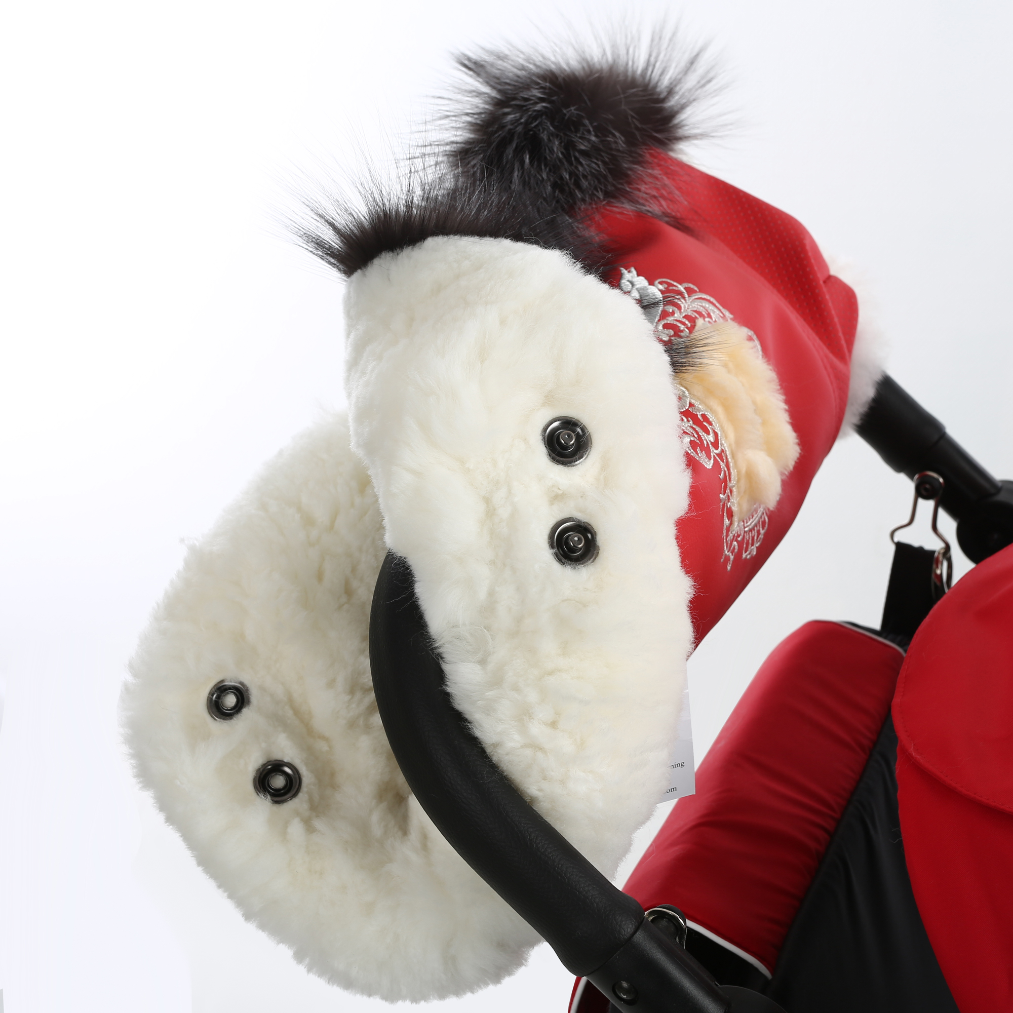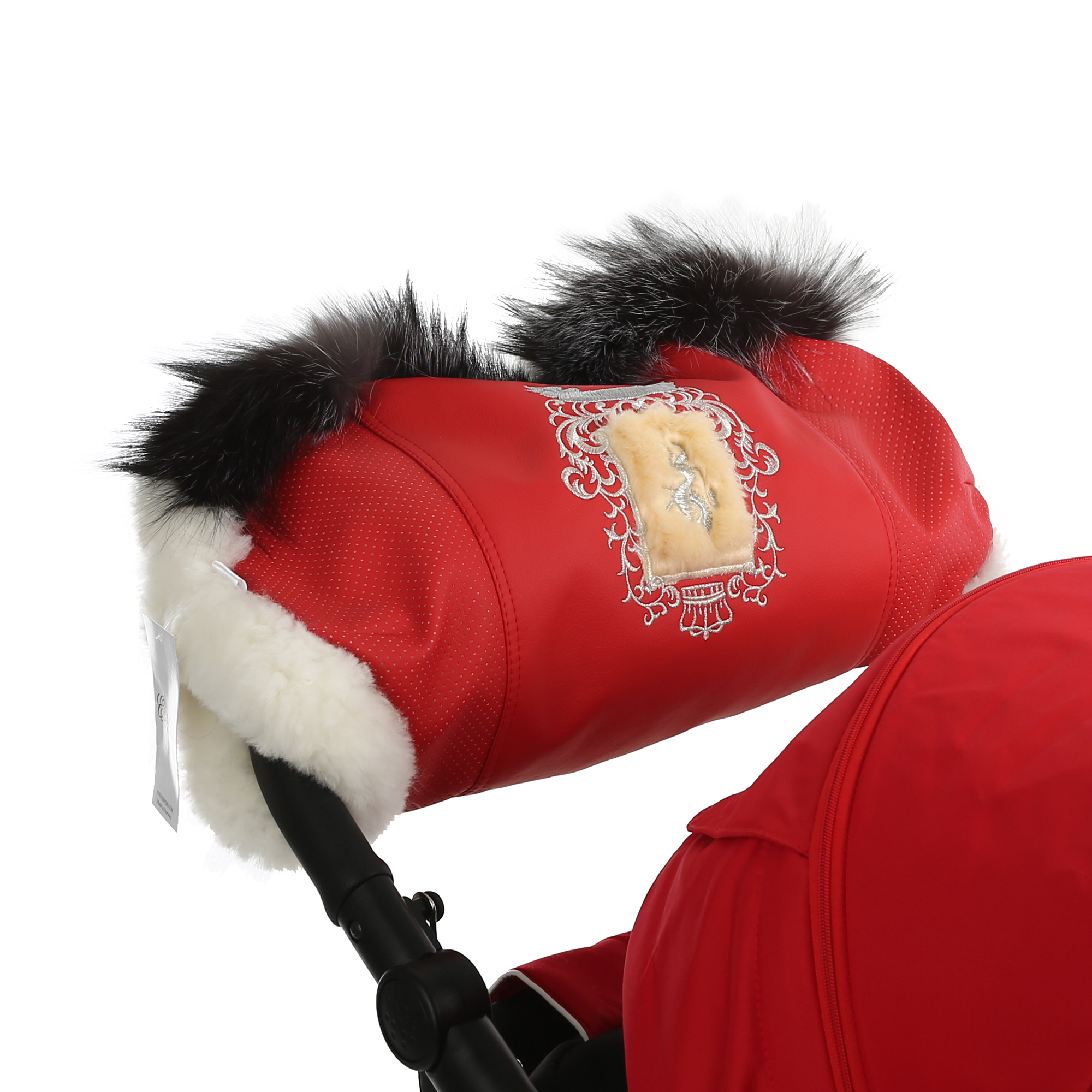 Верхнее покрытие состоит из перфорированной эко-кожи, которая не промокает и не продувается ветром. Все материалы прошли проверку на гипоаллергенность и экологическую чистоту. Муфта отлично подходит для колясок всех типов с цельной ручкой. Благородная меховая опушка и вышитый вензель подчеркнут вашу индивидуальность.
