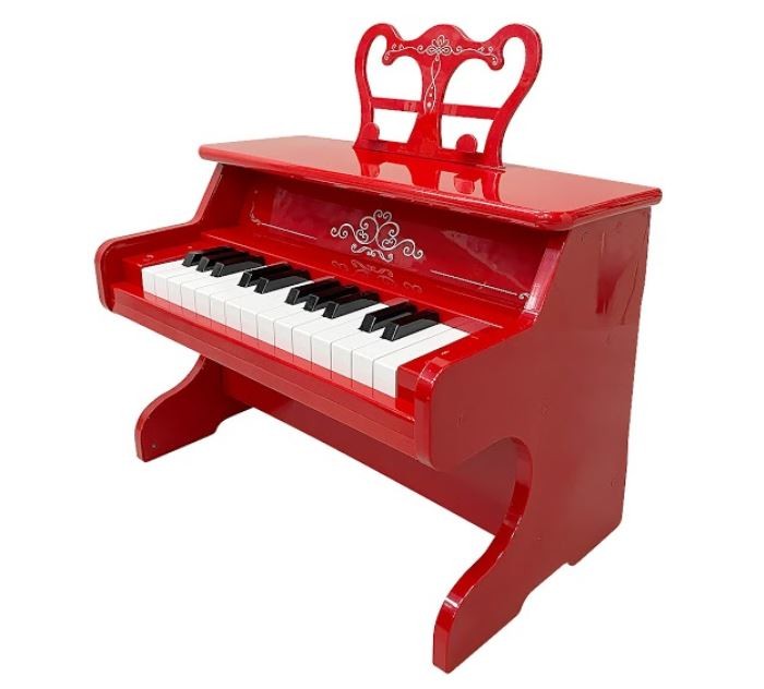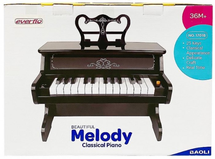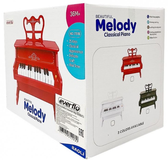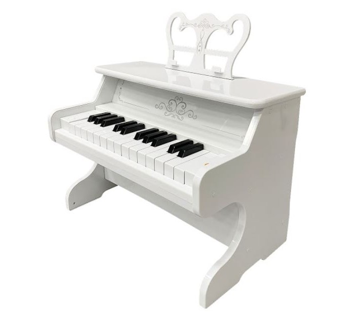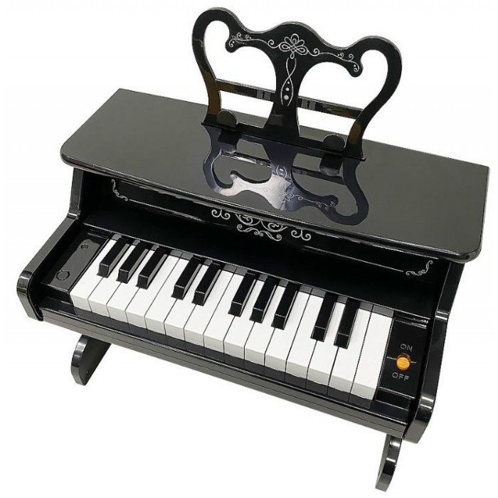 Модель имеет держатель для нот (пюпитр). 25 клавиш звучат как у настоящего инструмента, позволяя наигрывать несложные мелодии в рамках 2-х октав, развивать музыкальный слух и чувство ритма, разрабатывать гибкость и пластичность пальчиков малыша, подбирать музыку на слух.