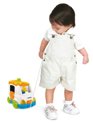 Если ребенок потянет вагончик за веревочку, то включаться фары и раздадутся звуки.