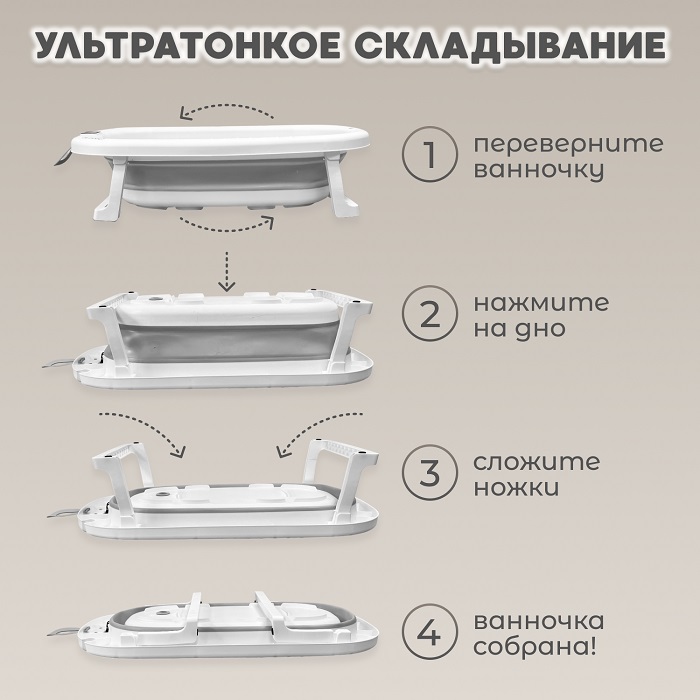 Складная ванночка легко раскладывается и складывается всего за несколько секунд, занимая минимум места при хранении.