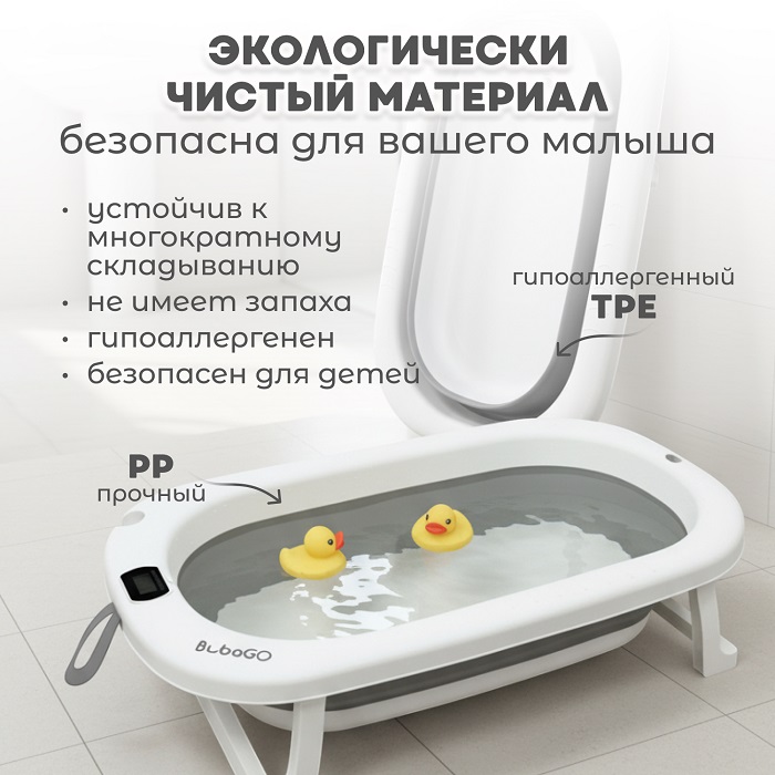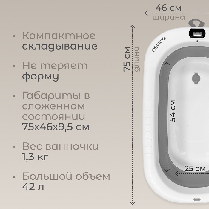 - Складная ванночка с встроенным термометром – обеспечивает точный контроль температуры воды, гарантируя безопасность и комфорт малыша.