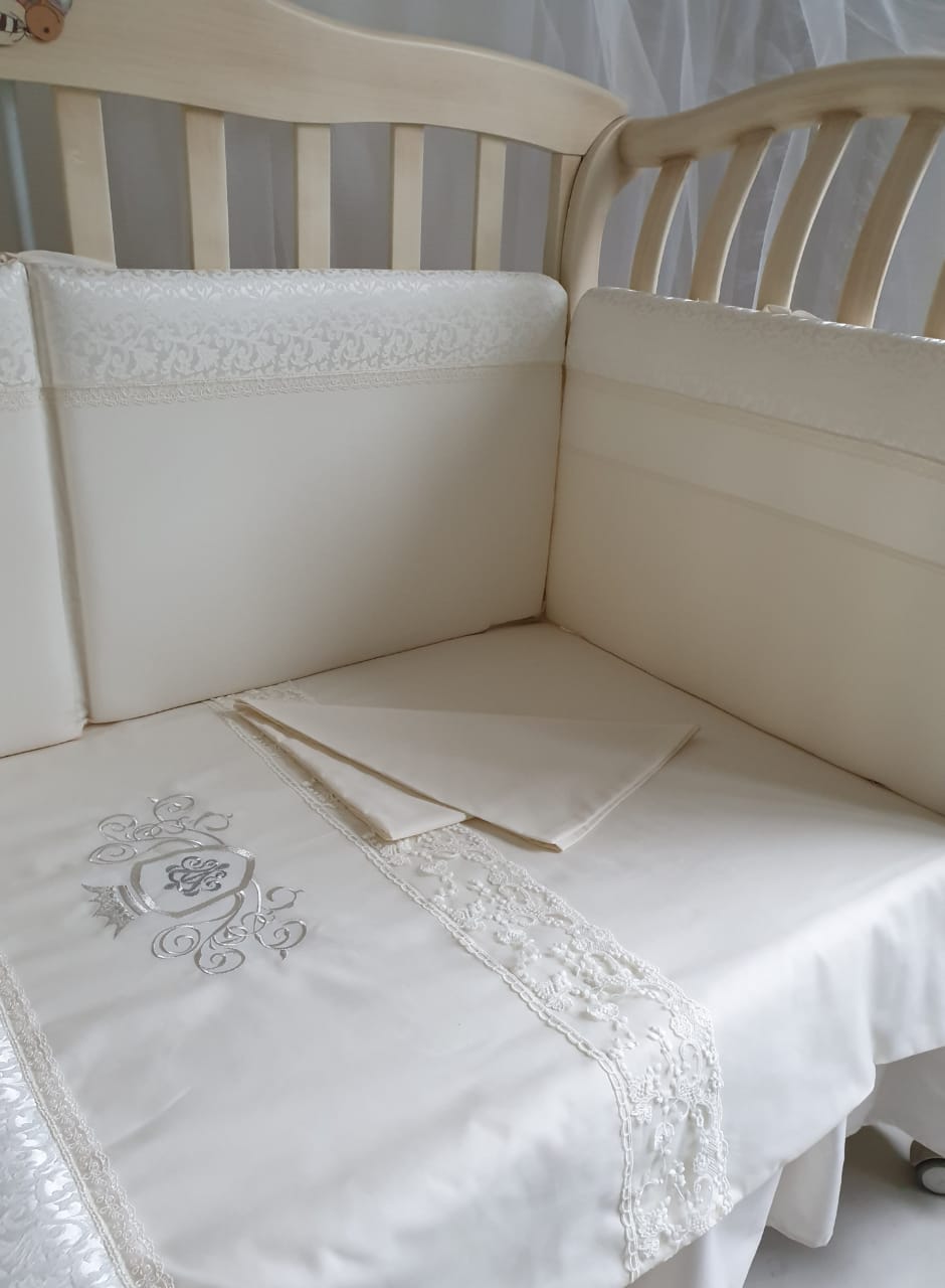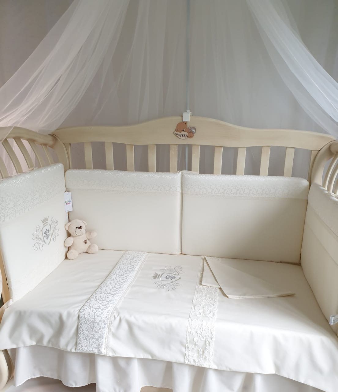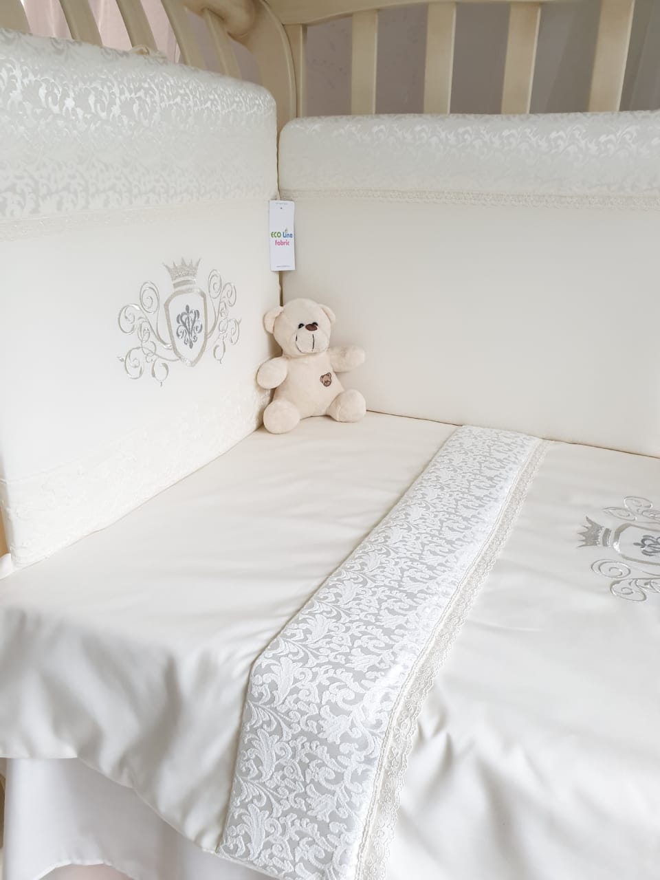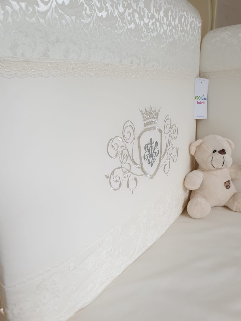 Набор в детскую кроватку для новорожденных Ecoline ROYAL карета (Эколайн Роял) - по настоящему шикарный классический комплект для классической кроватки. Благодаря дизайну комплекта, который полностью соответствует названию набора, малыш будет окружен красотой и уютом с первых дней жизни. Только натуральные ткани, только высококачественный утеплитель, ортопедическая подушка, мягкий прикроватный бортик для защиты младенца от повреждений.