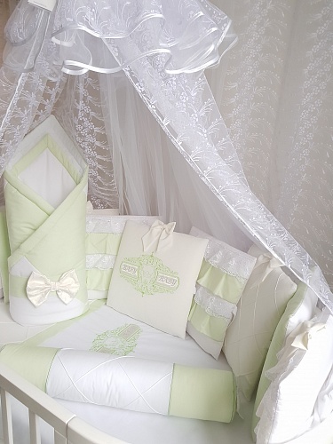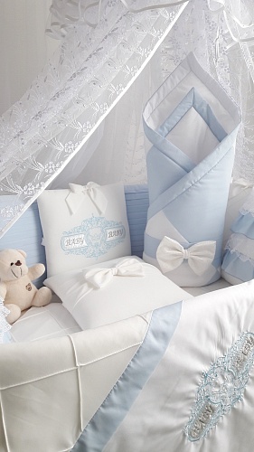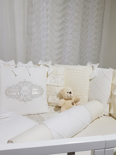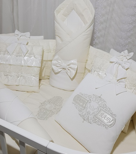 - В комплект входит 20 предметов: подушки простеганный каретной стежкой - 11 шт, одеялко с пододеяльником на молнии - размер 90х120, подушечка с наволочкой под голову - размер 40х60, 2 простыни, валик, выписной конверт с бантиком.