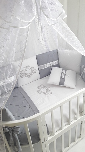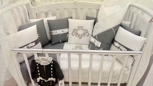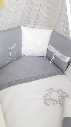 - Комплект состоит из 19 предметов: простынку на резинке, подушку, одеяльце, которое легко трансформируется в конверт, наволочку, защиту на бортики кроватки и прочие необходимые изделия.