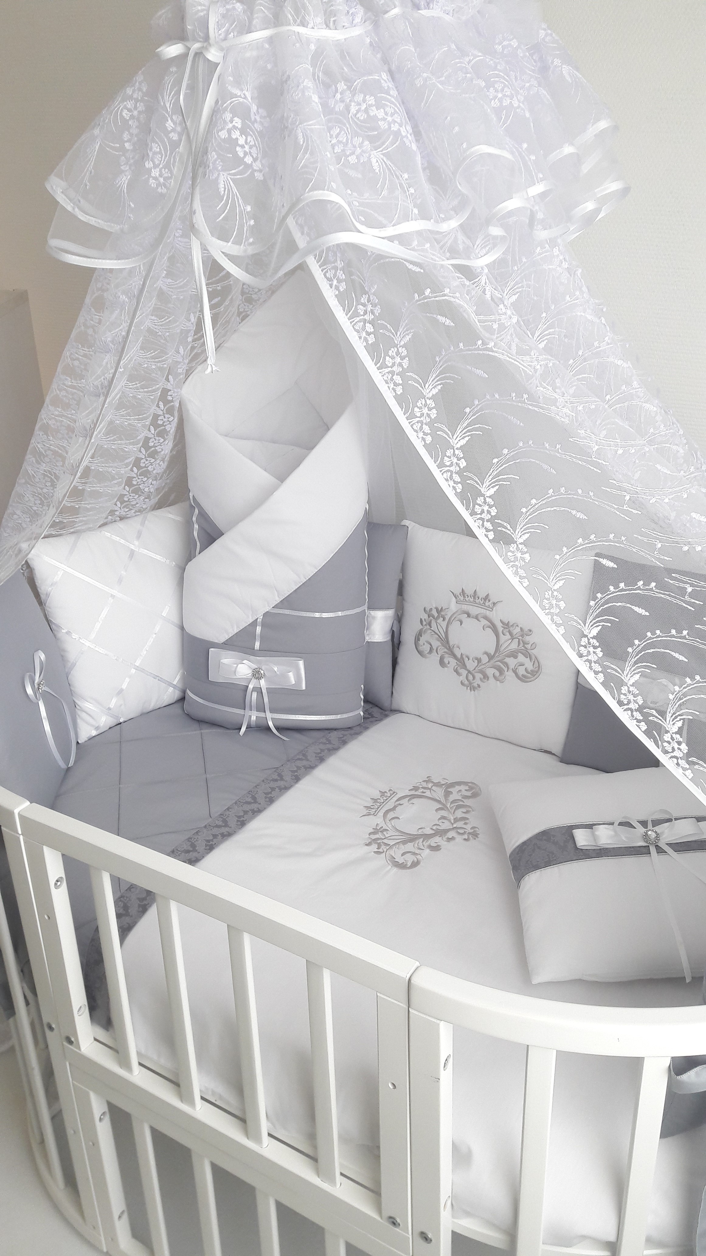 Набор в круглую и овальную кроватку Ecoline Bridget (эколайн бриджит) - элегантный комплект для колыбели ребенка с вышивкой и бантами. Весь комплект выполнен из сатина и отличается высоким качеством, изысканным дизайном и практичностью. Сатин идеальный материал для первого постельного белья ребенка. Он качественный, с отличной вентиляцией, хороши впитывает влагу, отталкивает частички пыли и прост в уходе. За комплектом легко ухаживать и он долго будет сохранять свой первоначальный вид.