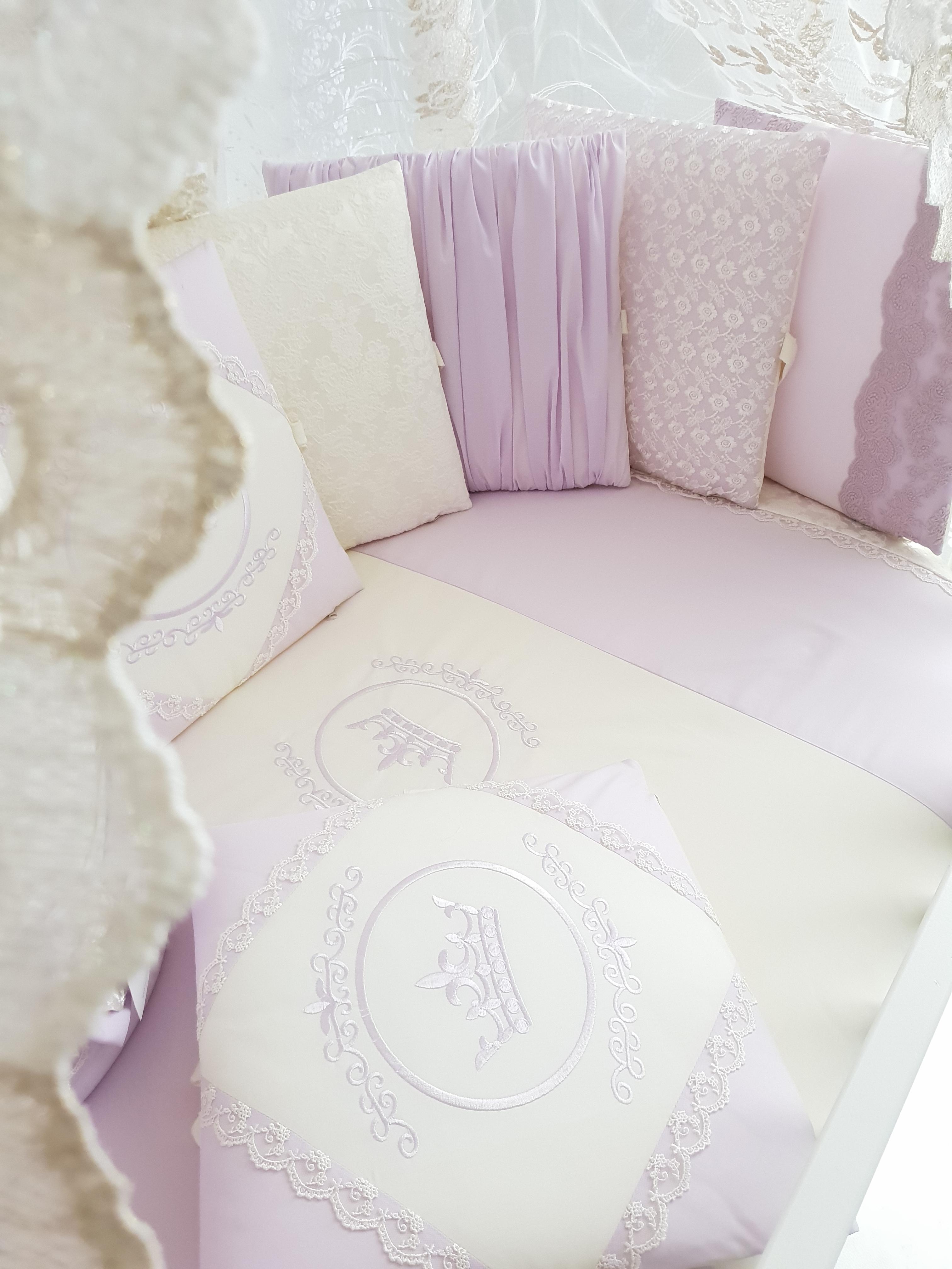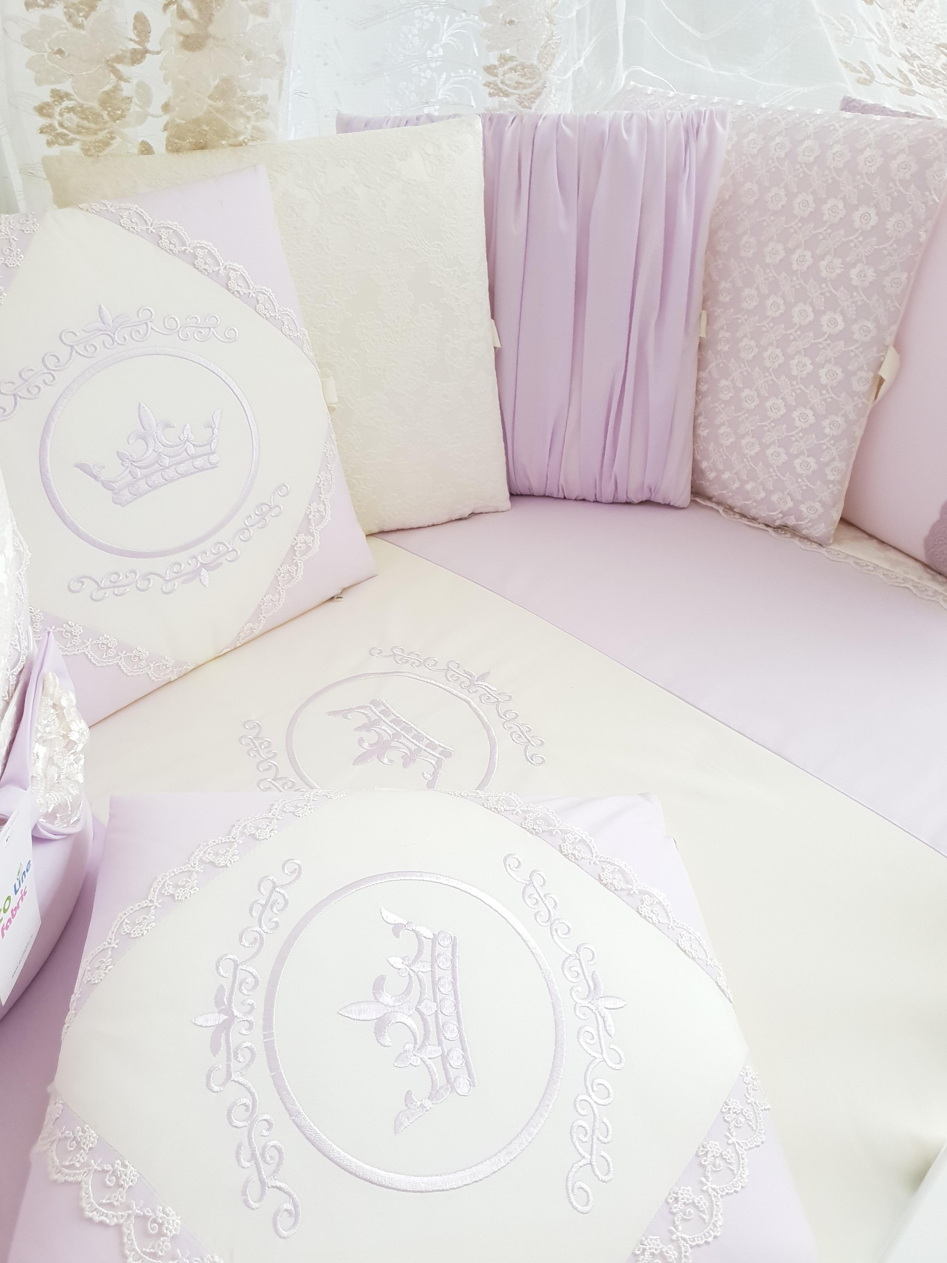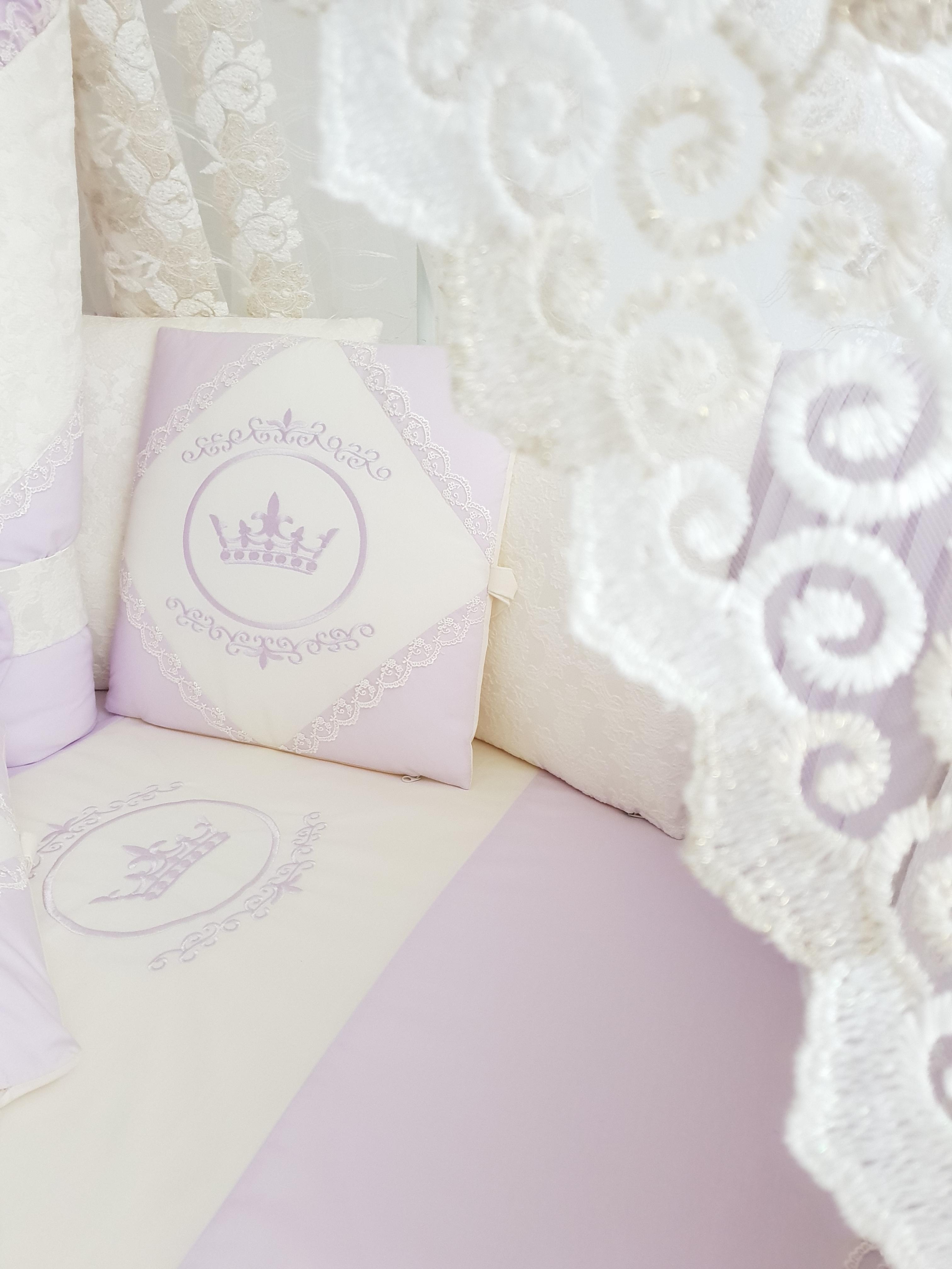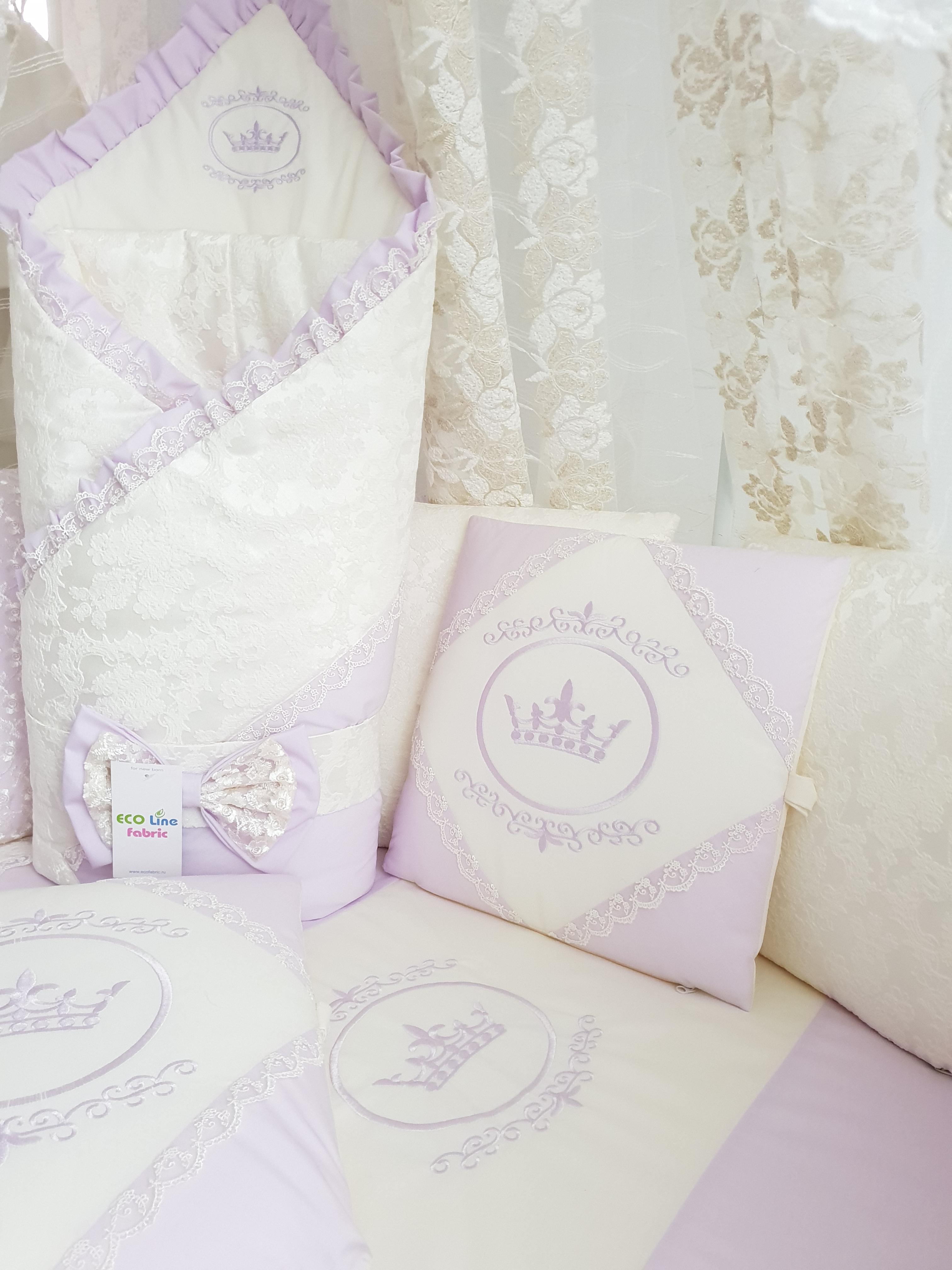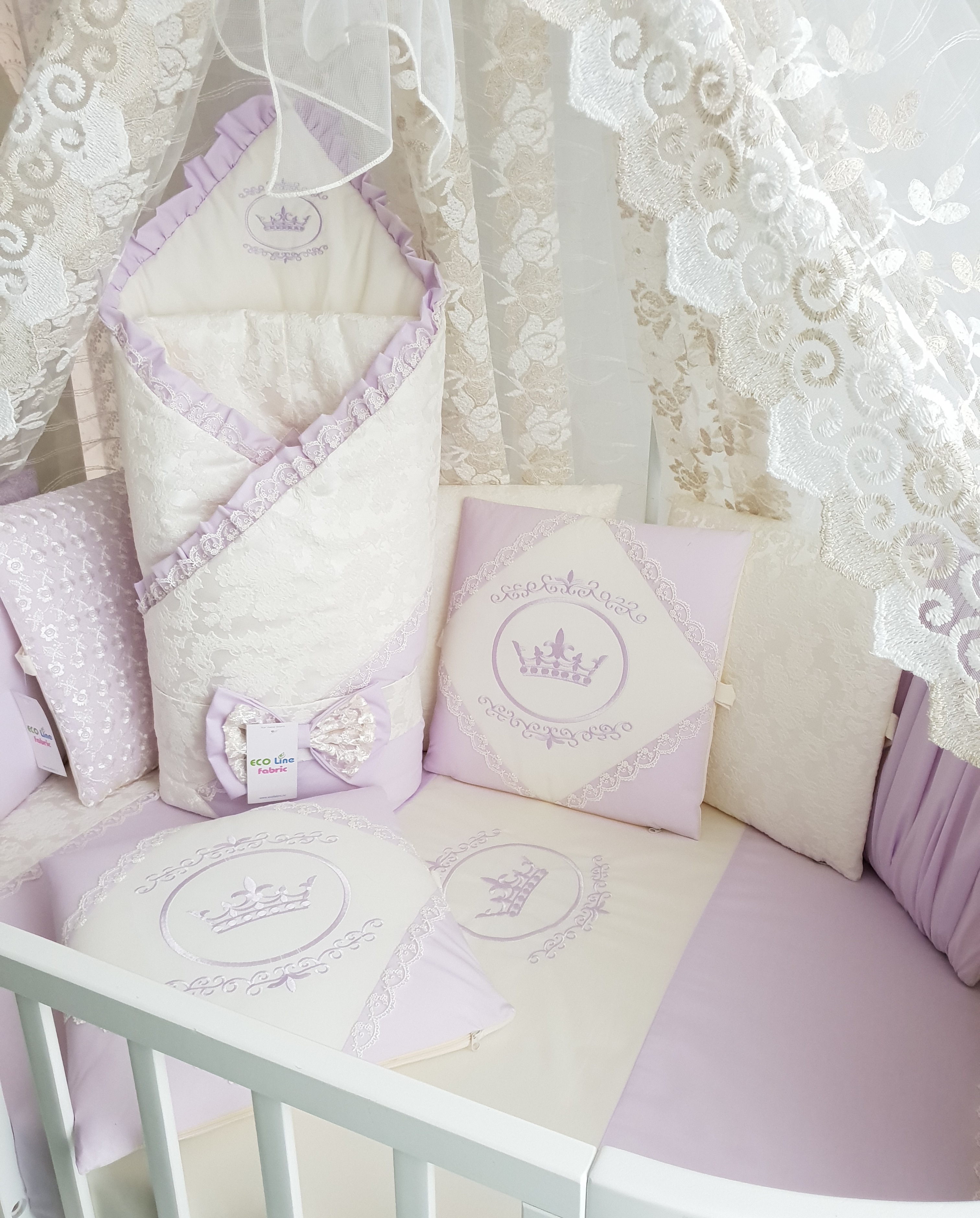 Набор в круглую кроватку Ecoline BENITA light (эколайн бенита лайт) - очень красивый комплект, украшенный нежным кружевом, фактурной тканью и вышивкой. В комплект входит все самое необходимое для ребенка с рождения до 3-4 лет. Бортики (мягкие подушечки с завязками), одеялко со съемным пододеяльником, подушка с наволочкой и универсальная простынь на резинке. За комплектом очень легко ухаживать , а за счет высокого качества материалов он прослужит вам долго, не потеряв свой первоначальный вид.