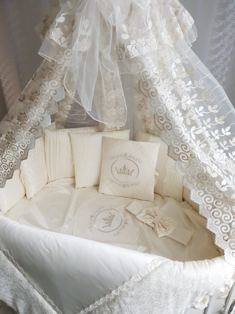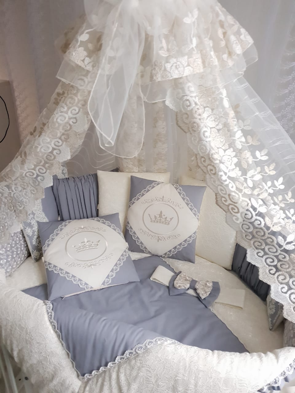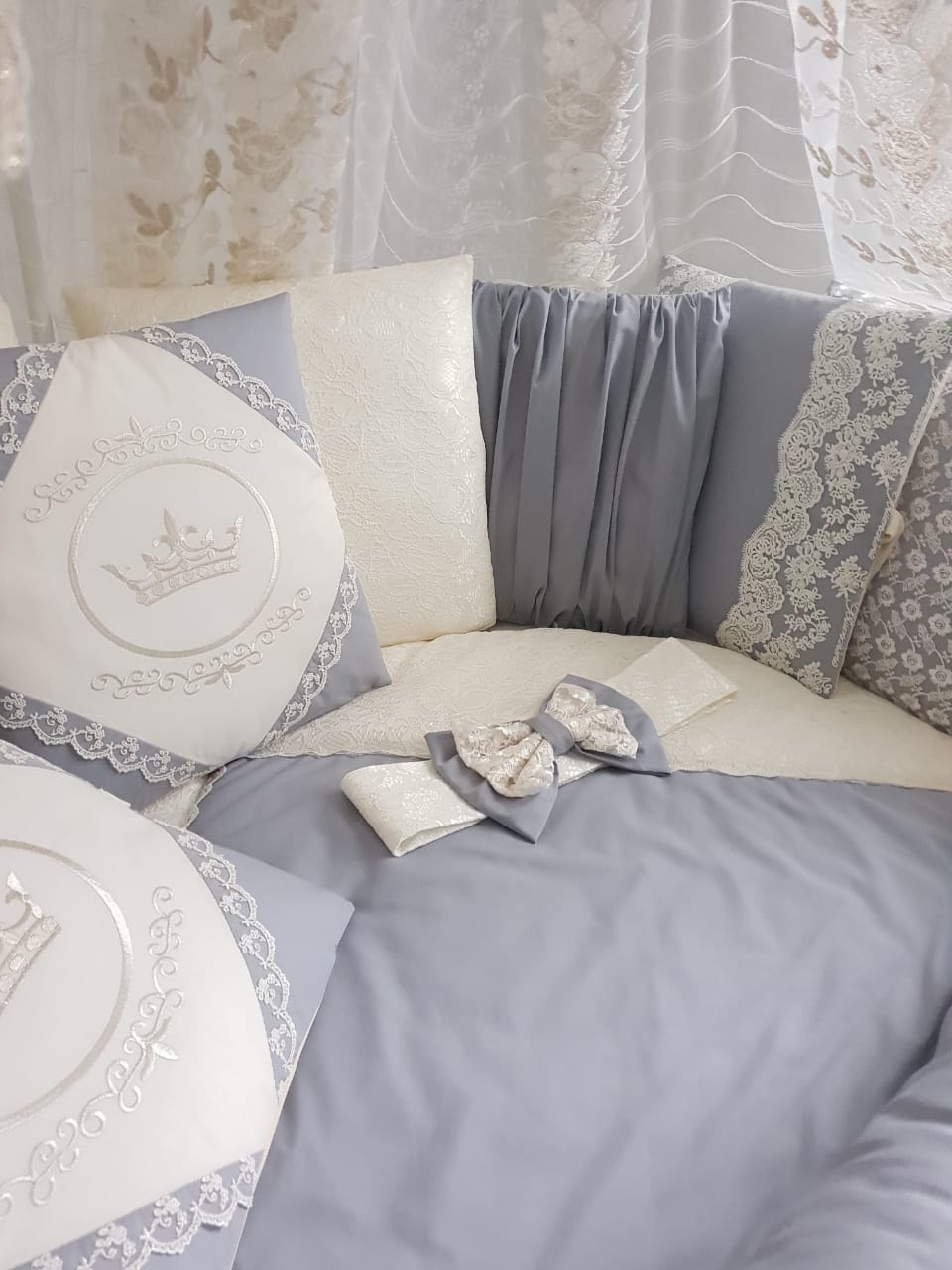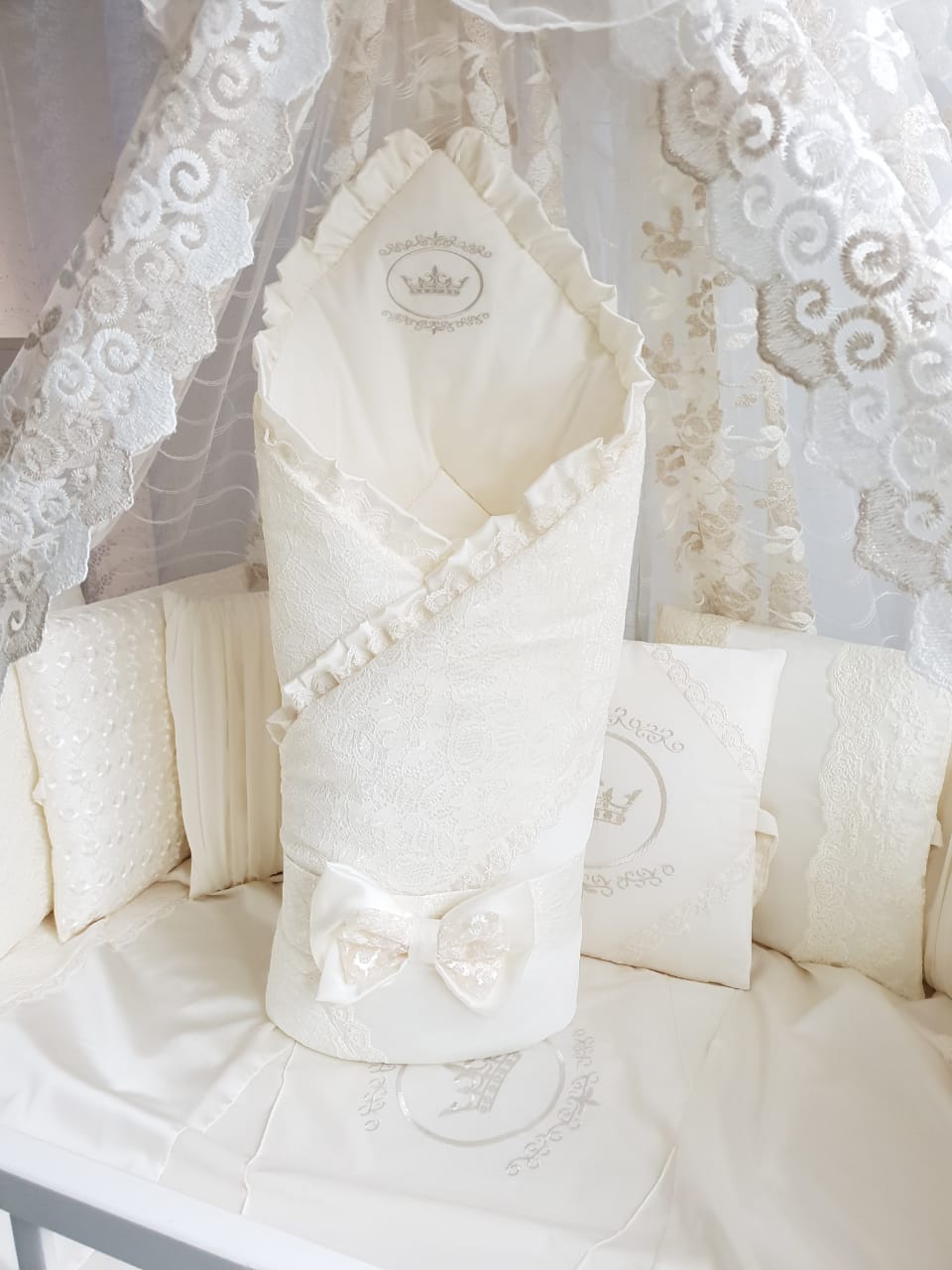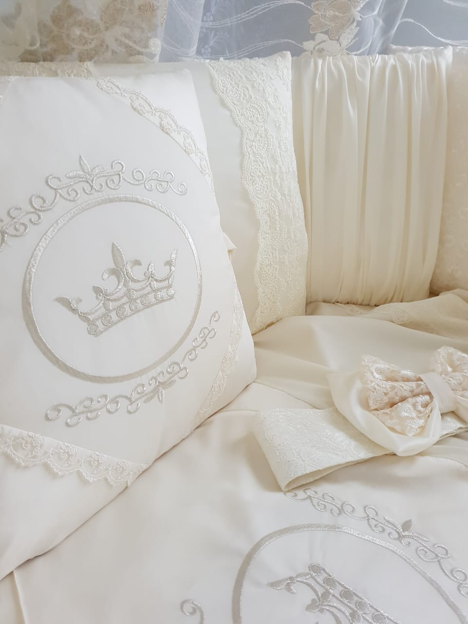 Набор в круглую кроватку Ecoline BENITA light (эколайн бенита лайт) - очень красивый комплект, украшенный нежным кружевом, фактурной тканью и вышивкой. В комплект входит все самое необходимое для ребенка с рождения до 3-4 лет. Бортики (мягкие подушечки с завязками), одеялко со съемным пододеяльником, подушка с наволочкой и универсальная простынь на резинке. За комплектом очень легко ухаживать , а за счет высокого качества материалов он прослужит вам долго, не потеряв свой первоначальный вид.