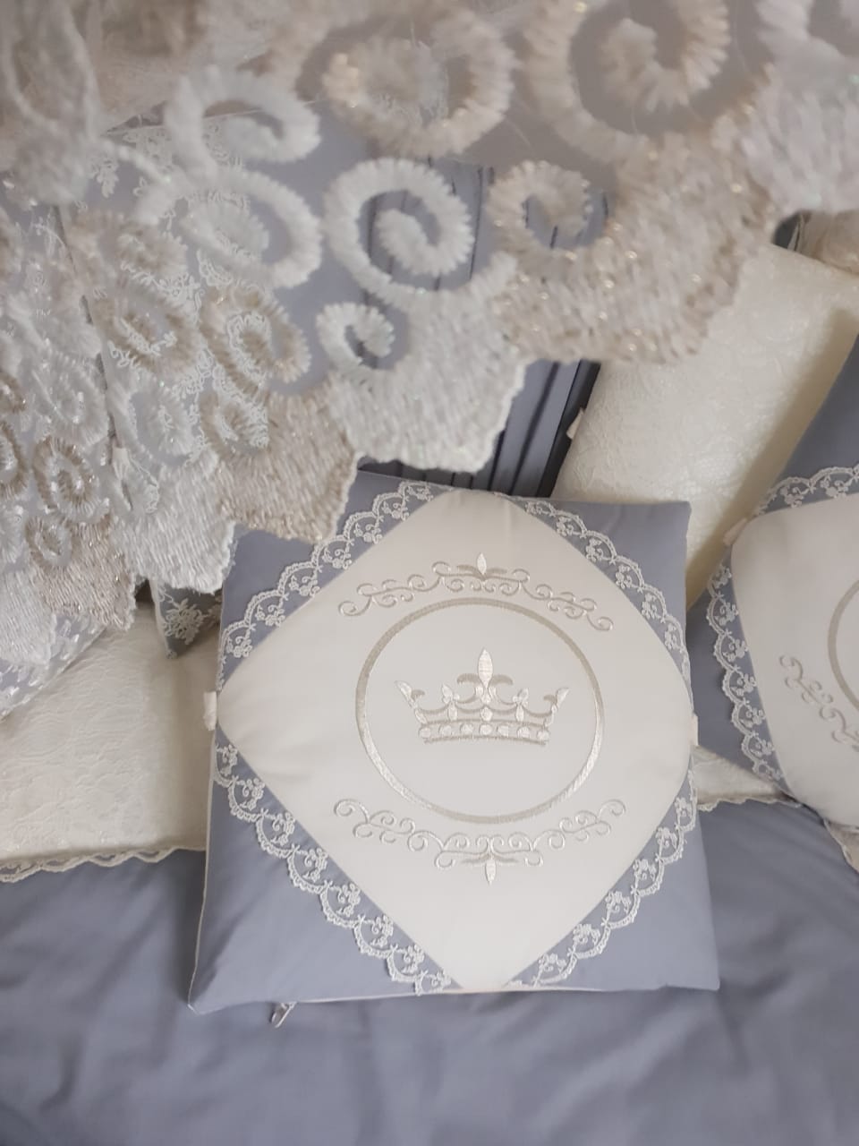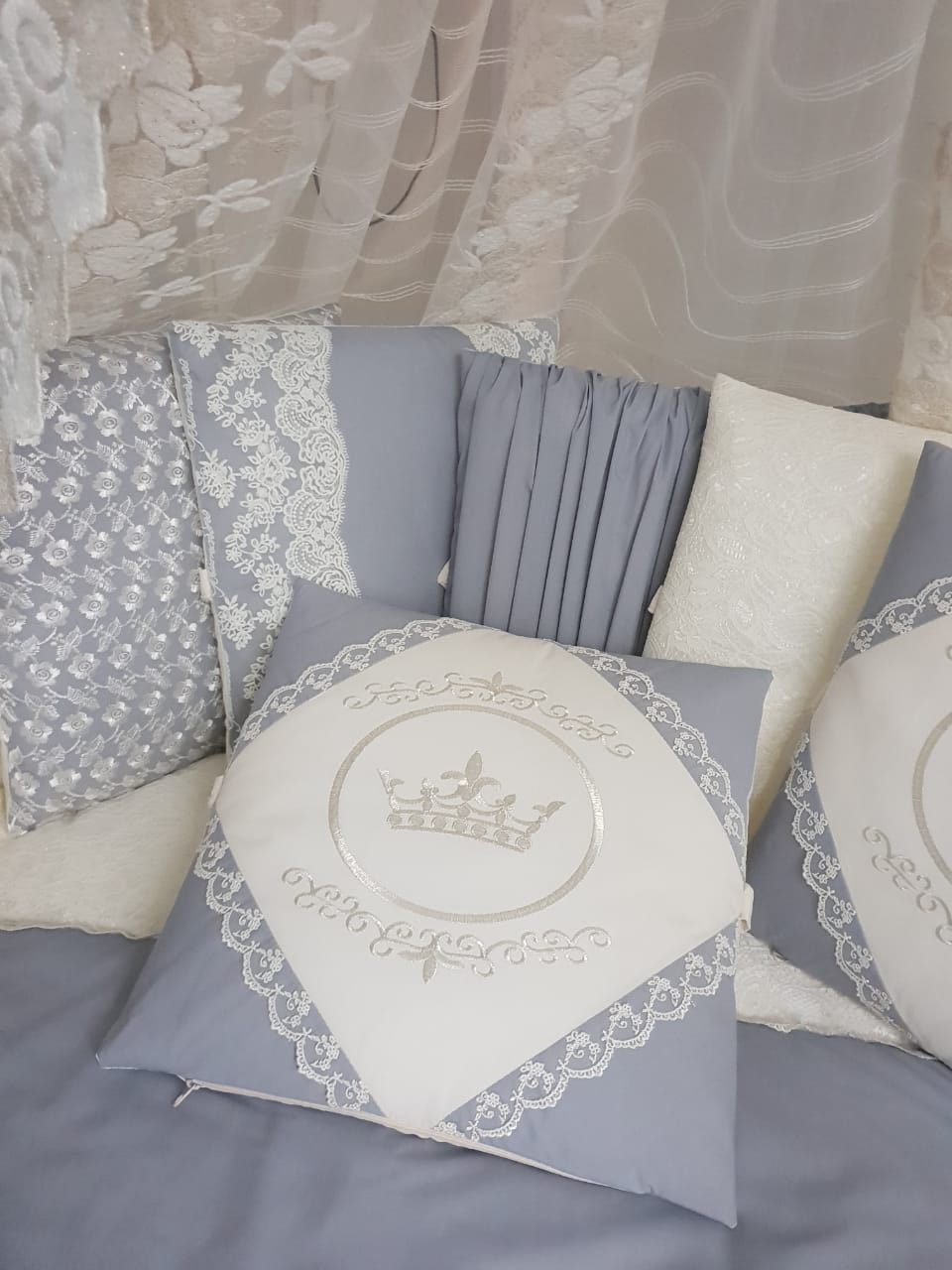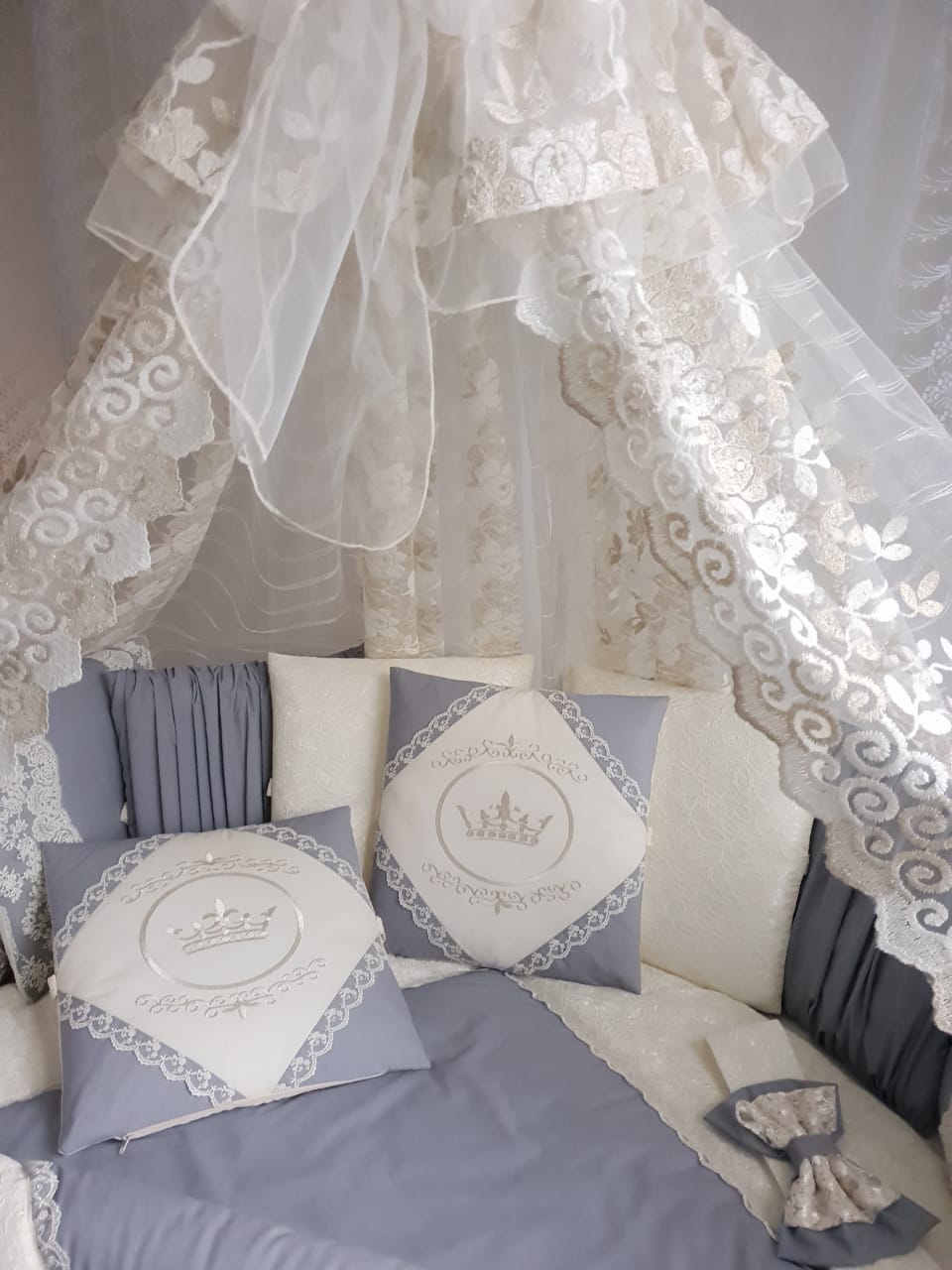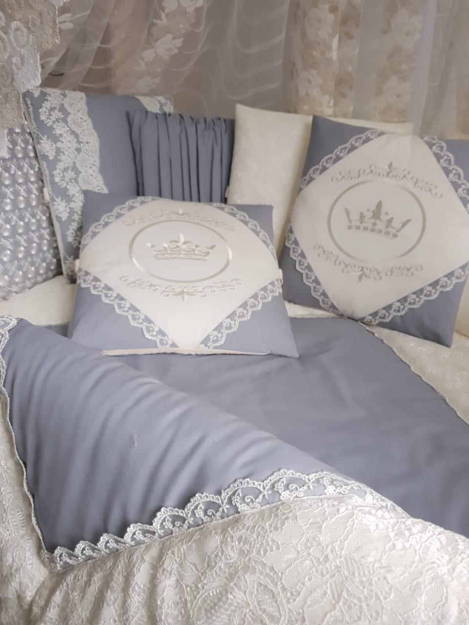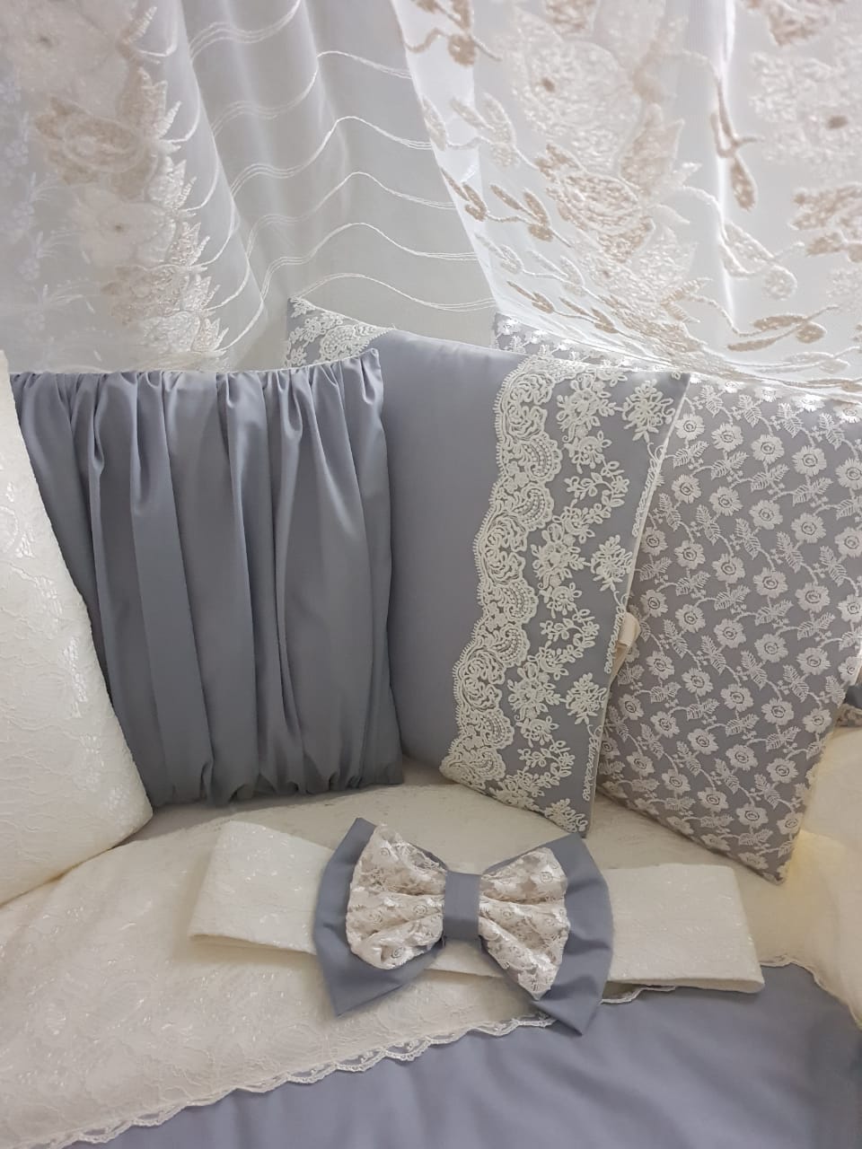Набор в круглую кроватку Ecoline BENITA light (эколайн бенита лайт) - очень красивый комплект, украшенный нежным кружевом, фактурной тканью и вышивкой. В комплект входит все самое необходимое для ребенка с рождения до 3-4 лет. Бортики (мягкие подушечки с завязками), одеялко со съемным пододеяльником, подушка с наволочкой и универсальная простынь на резинке. За комплектом очень легко ухаживать , а за счет высокого качества материалов он прослужит вам долго, не потеряв свой первоначальный вид.