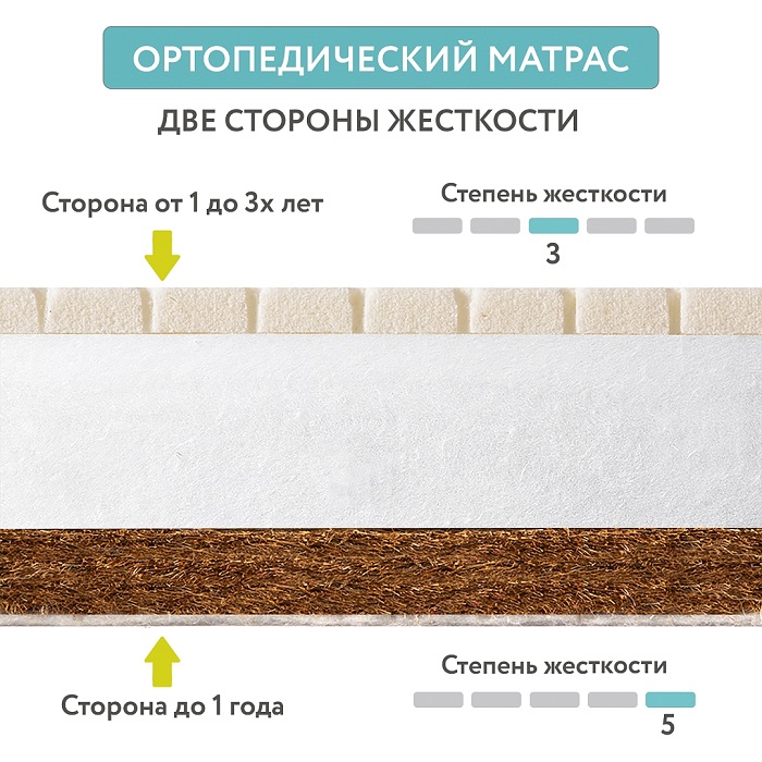 • Две стороны разной жесткости: жесткая сторона для сна в первые месяцы (5 из 5) и более эластичная для подрастающего малыша (4 из 5). Результат — спокойный, комфортный сон и правильная осанка.