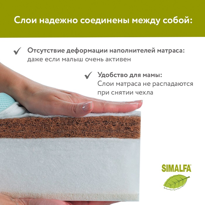 • Cлои матраса скреплены между собой. Важно: слои скреплены специальным экологичным составом Simalfa (производство Швейцария). Состав на водной основе, без запаха, безопасен для ребенка и имеет европейский сертификат качества.