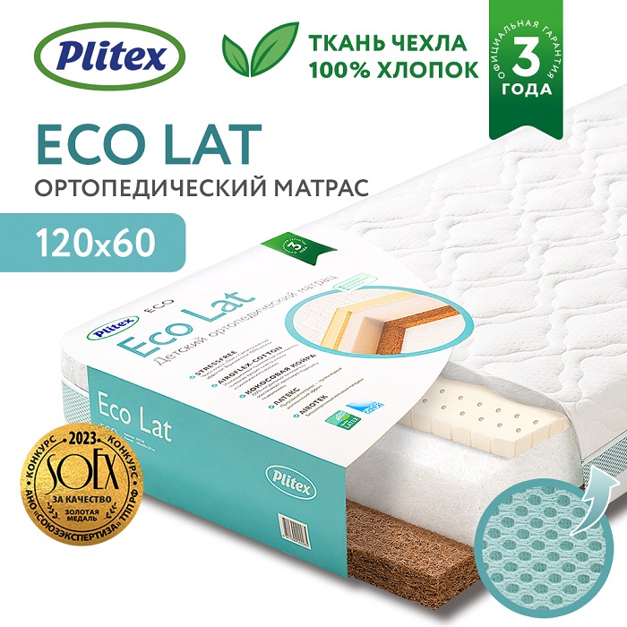 Ортопедический матрас Plitex Eco Lat 119х60х12 см - детский беспружинный матрас для детей от рождения до 3-4 лет в кроватку со спальным местом 120х60 см. Две стороны жесткости. Качественный сеъемный чехол который можно легко снять для стирки. Матрас получил немецкий сертификат качества Oeko-Texstandard 100 class 1 (самый высокий класс безопасности, означает, что матрас подходит для новорожденных).