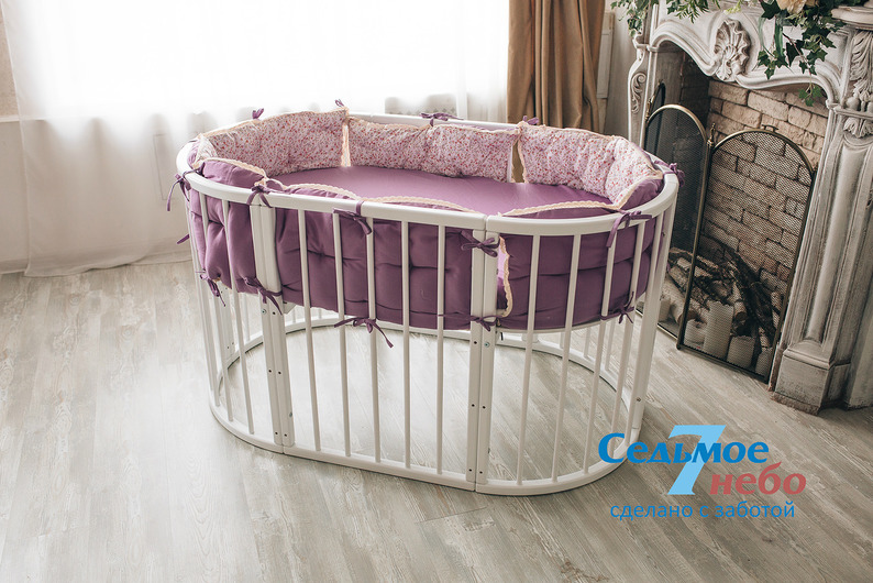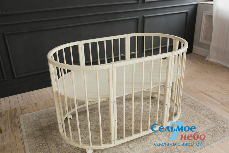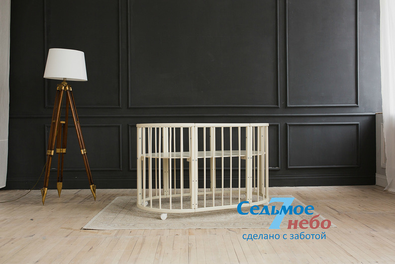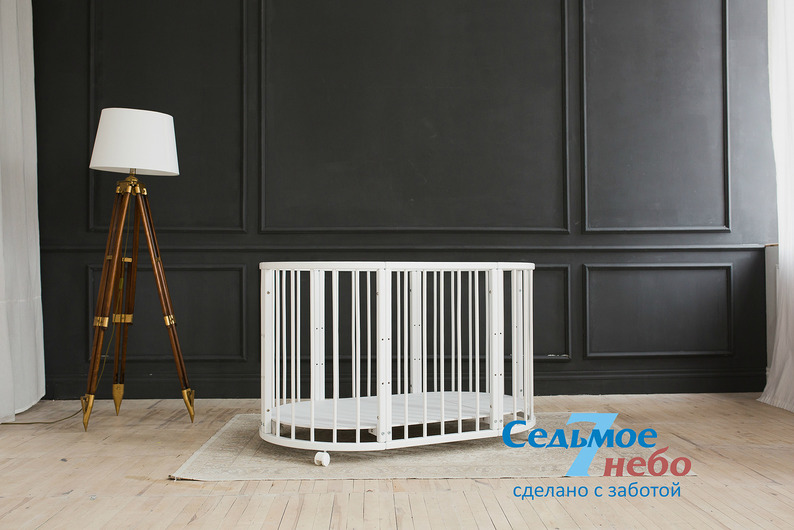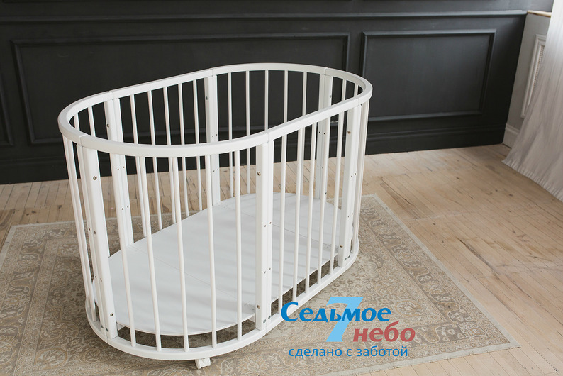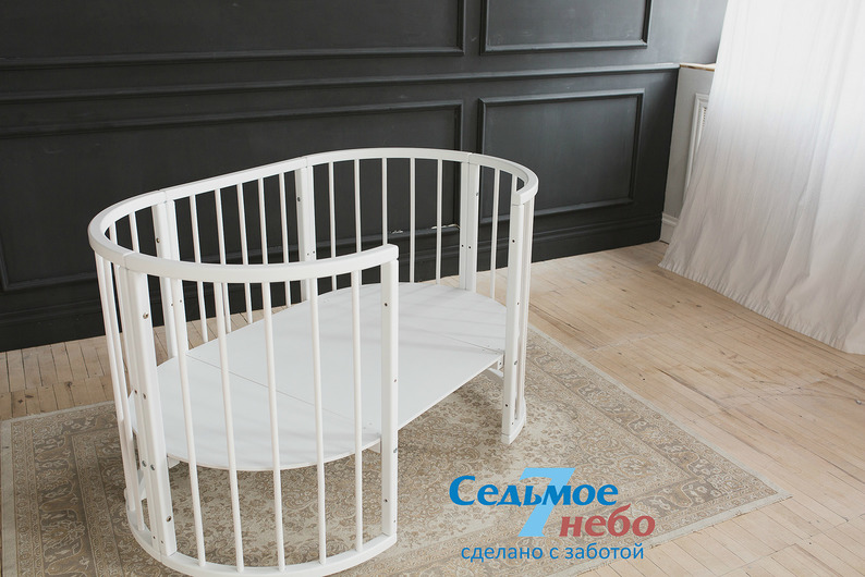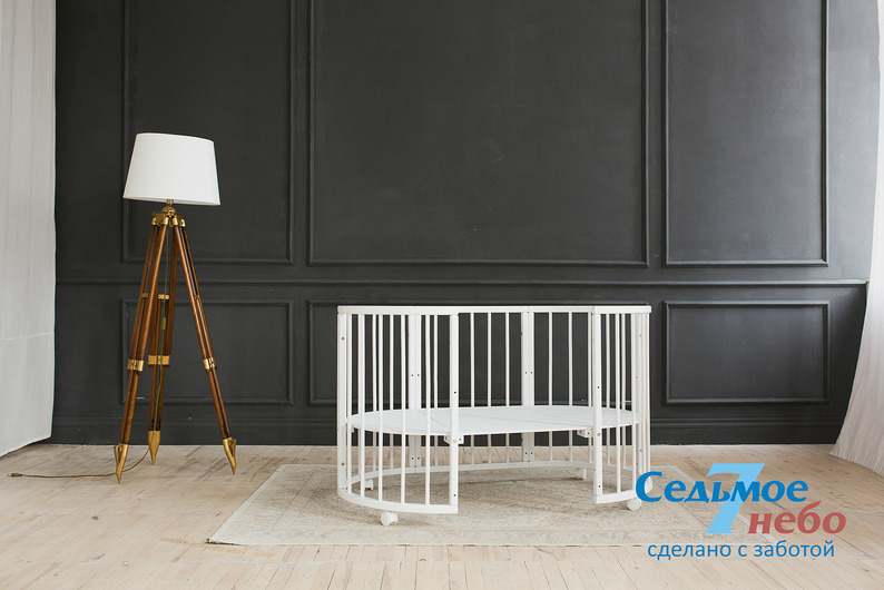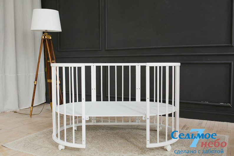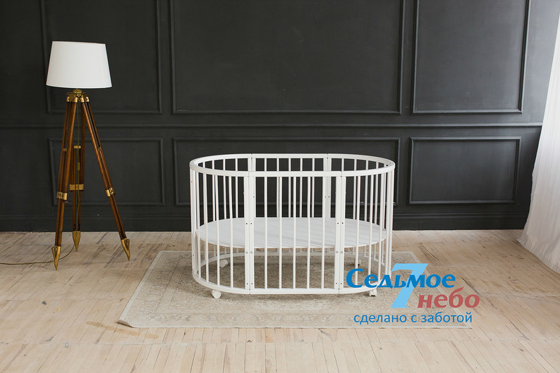 Кровать трансформер Седьмое небо Merry Happy Classic (мери хеппи классик) – это невероятно функциональная кроватка 6 в 1: круглая кроватка с пеленальным столиком с рождения до 6 месяцев, овальная кровать до 4 лет, манеж, столик, кресло, диван. В такой кроватке малышу первых месяцев жизни комфортно и уютно, и нет лишнего пространства как в прямоугольной кровати, которого очень часто боятся малыши. Такая кроватка не занимает много места и смотрится очень современно и стильно. Теперь не придется выбирать, что купить колыбельку или полноценную кровать, нужно ли покупать пеленальный столик или нет. Вы сами сможете менять конфигурацию вашей детской кроватки и подстраиваться под вашего ребенка. Меняйте, решайте и фантазируйте, с кроваткой Merry Happy вам будет весело и интересно. Кроватка сделана из качественных и безопасных материалов. Удобна и проста в использовании.